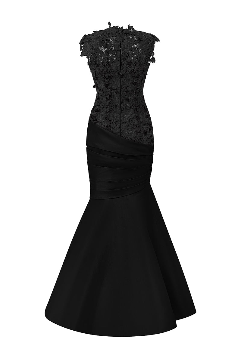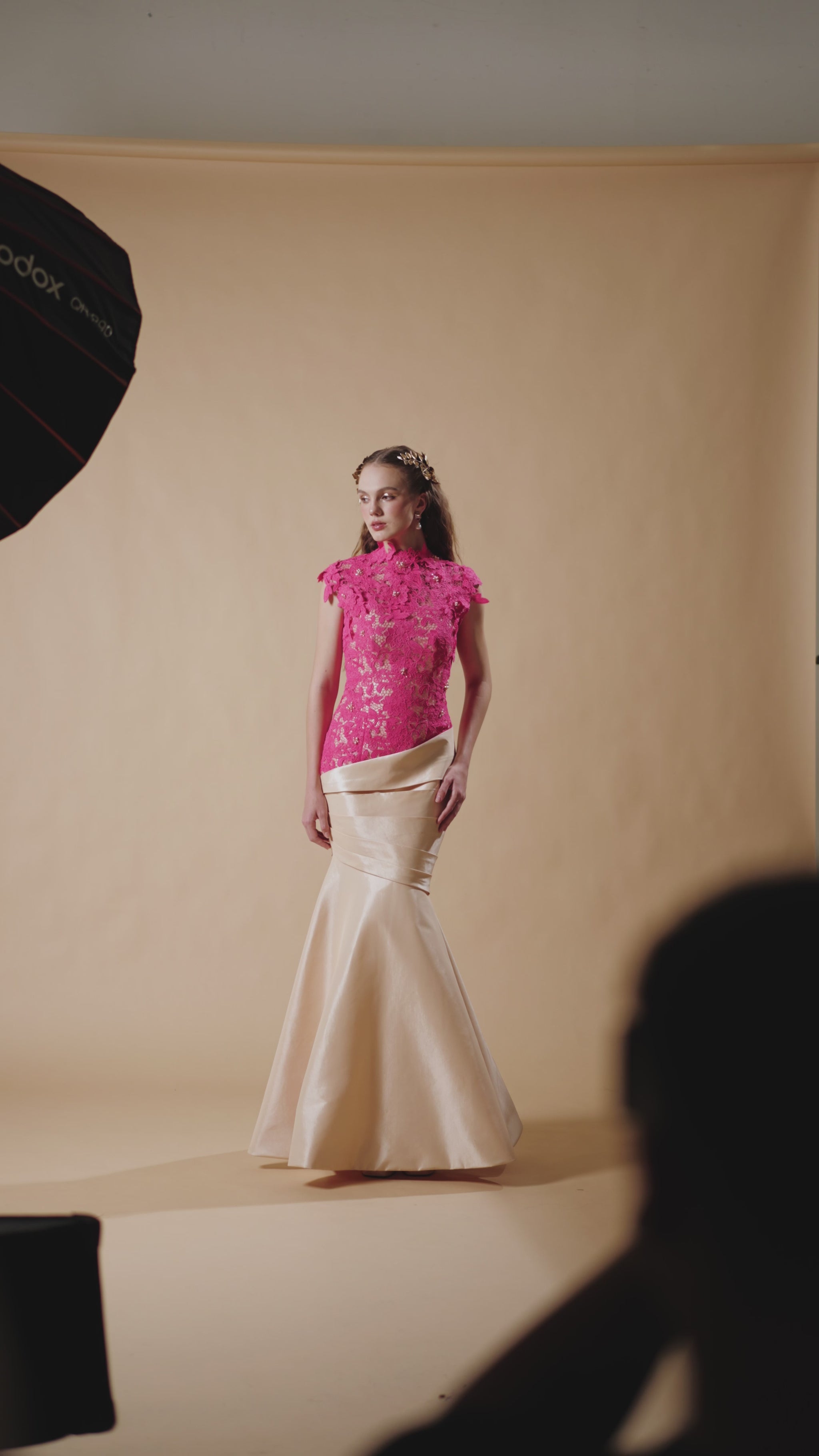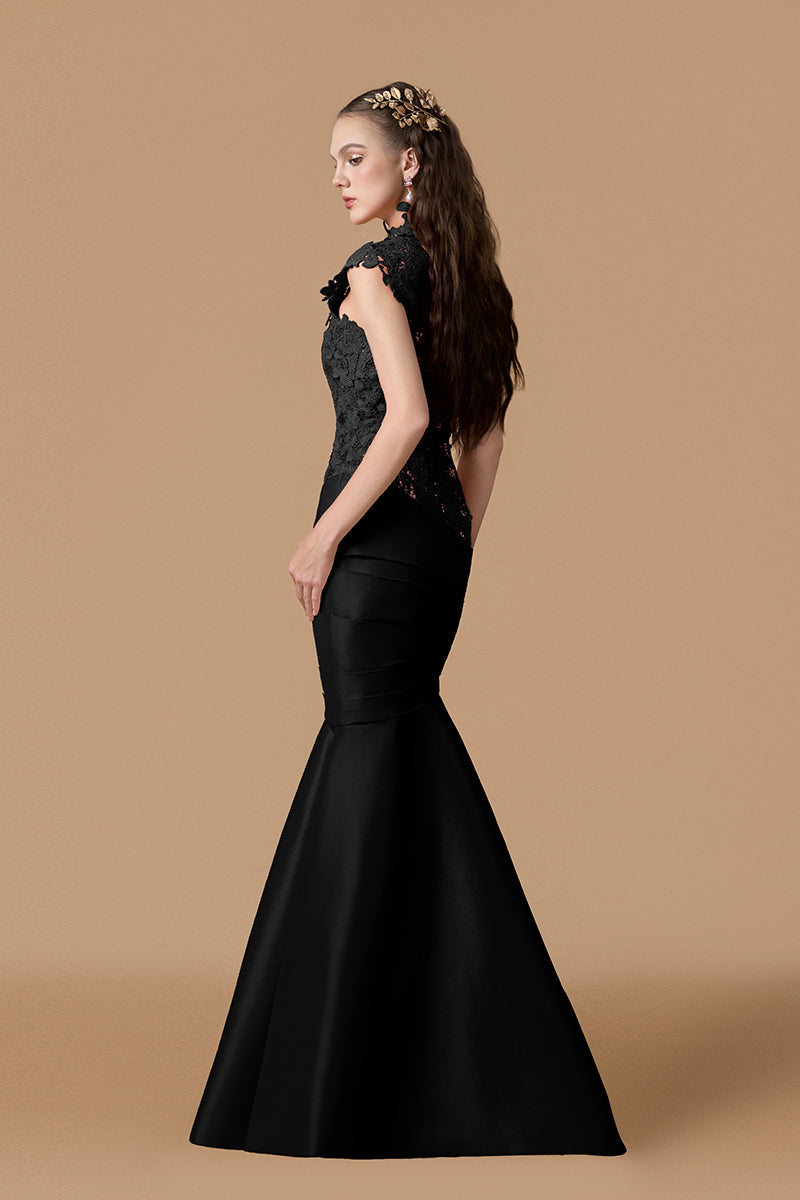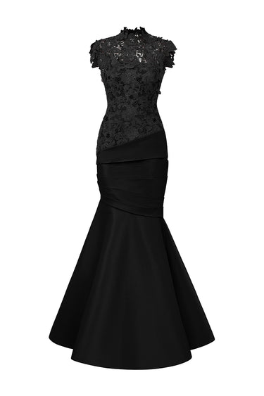 La robe sirène à col rond en dentelle guipure et taffetas révèle une harmonie captivante entre structure et féminité. Le corsage ajusté, confectionné en dentelle florale délicatement ornée de cristaux, scintille doucement sous la lumière. Se prolongeant en une jupe sirène sculpturale en taffetas, la robe offre un drapé gracieux, ample et brillant. Le col rond haut et la coupe sans manches soulignent l'élégance et la grâce, faisant de cette robe une incarnation raffinée du charme de la haute couture moderne.