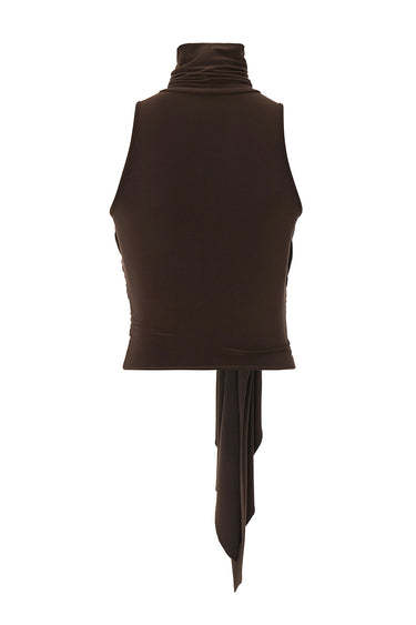 Débardeur marron chocolat à col montant et empiècements drapés sur le devant, élégamment noués à la taille. Confectionné dans un tissu stretch doux, il crée une silhouette fluide et sculptée.