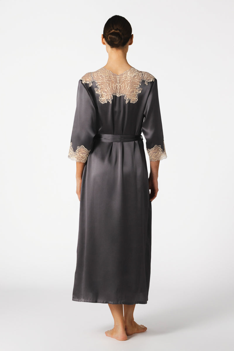 - Full-length robe in grey silk charmeuse with champagne lace trim.