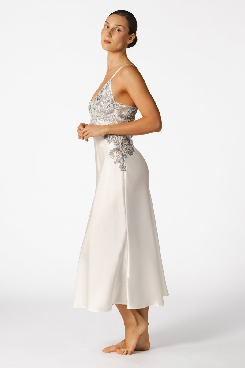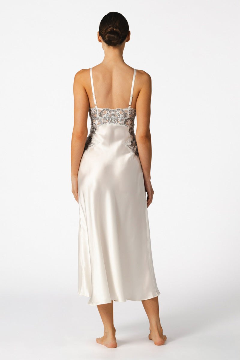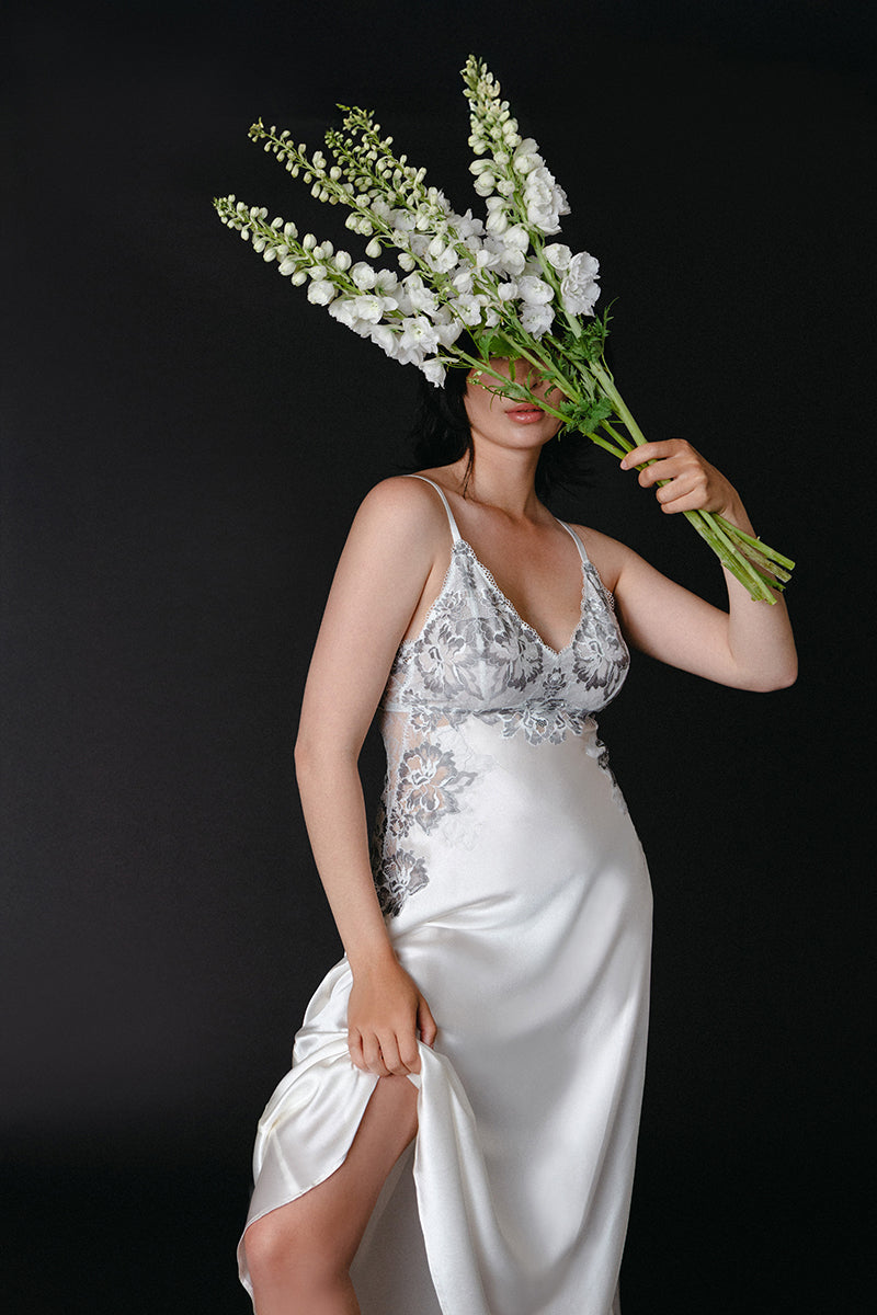 Like a spring flower in bloom, the Raquel Feminine Lounge Swing Silk Chemise’s delicate hues will enchant the senses while the intricate lace bandeau-style bust is sure to please. Made with hours of work from our skilled artisans, these soft lace details bring this chemise from the sheets and to the streets as a day-to-night dress. Pair it with the Raquel Feminine Lounge Midi Kimono when staying in for maximum decadence.