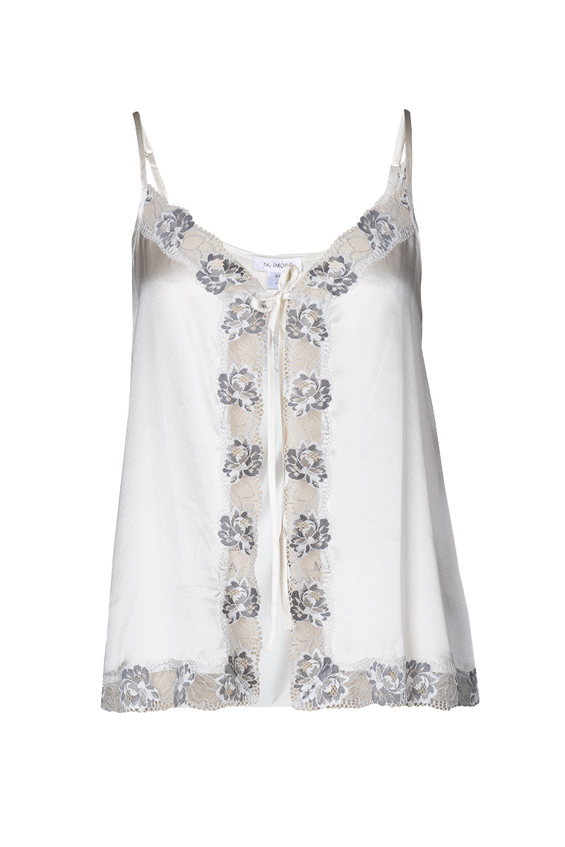 - Ivory silk charmeuse camisole with V-neckline and lace trim.