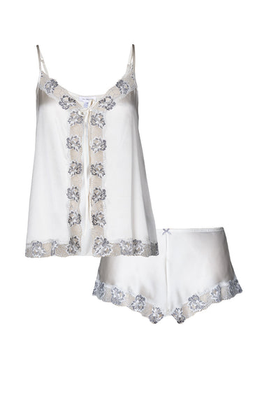 The Mimi Bridal Cami Set combines understated elegance with comfort. Crafted in ivory silk charmeuse with lace accents, this camisole and matching shorts set is perfect for pre-wedding rituals, gifting, or honeymoon lounging.