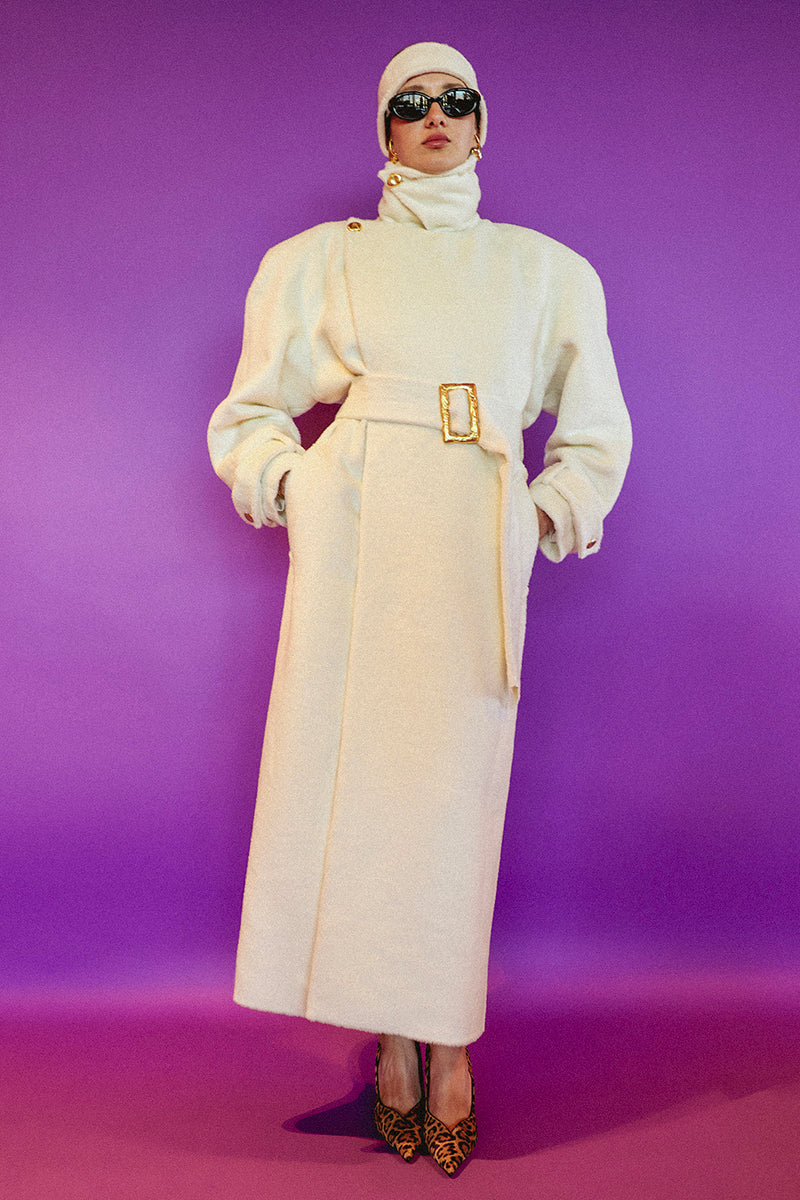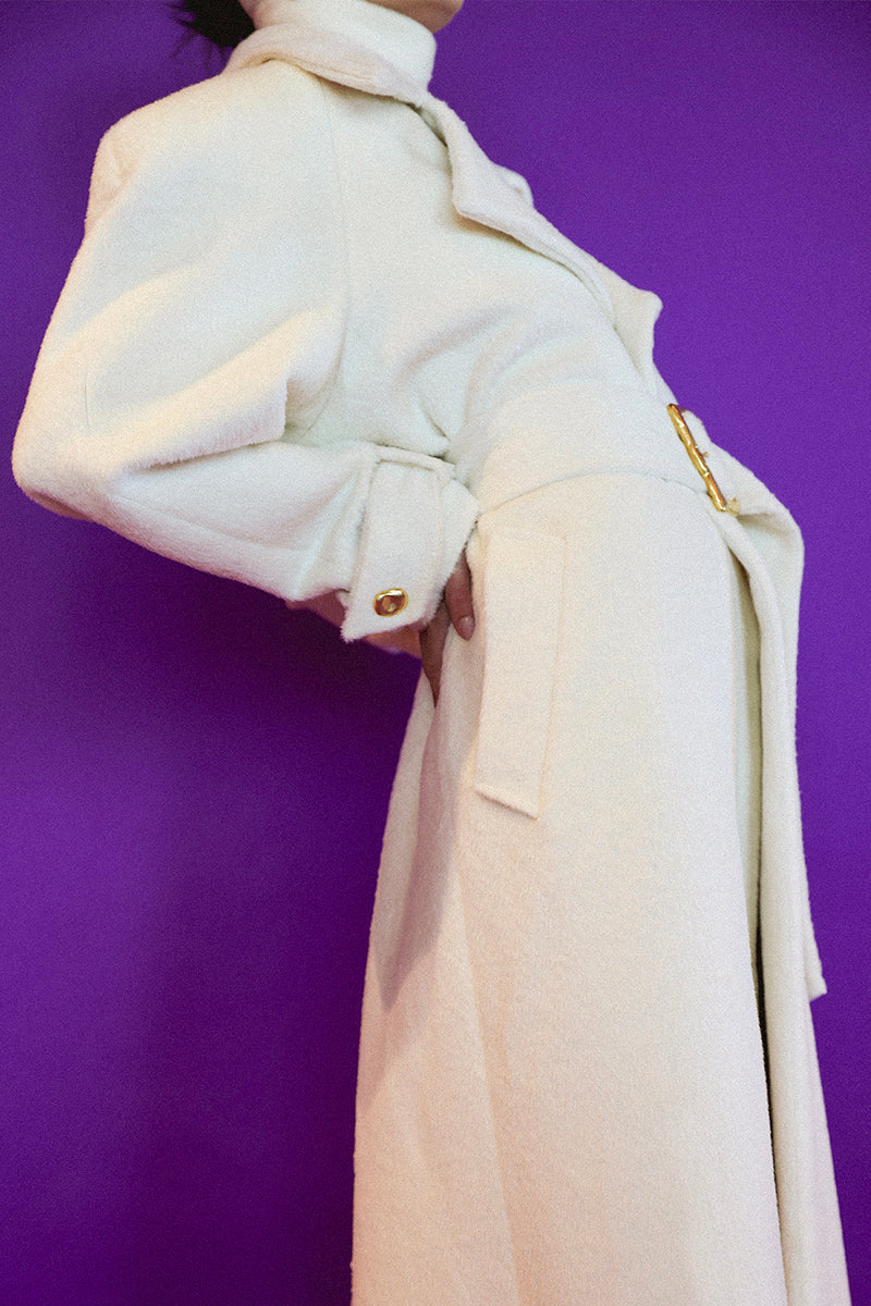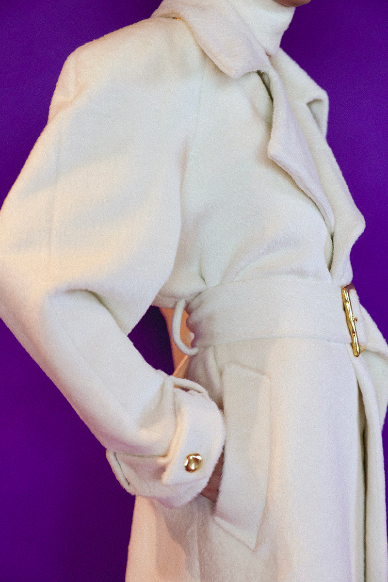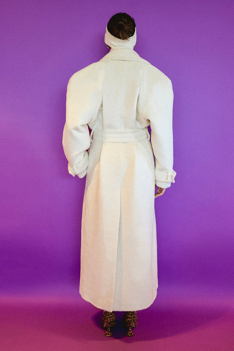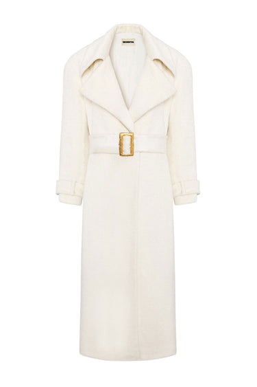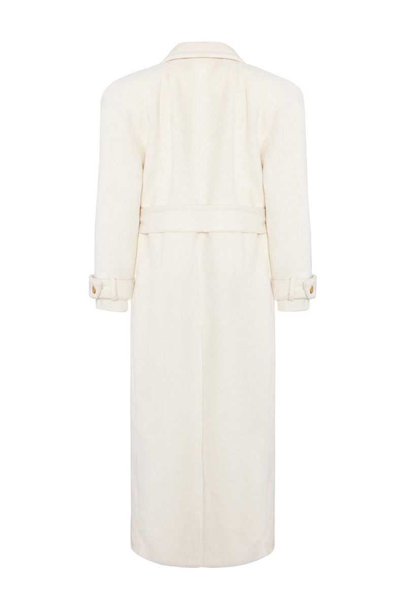 Manteau long structuré en laine blanc asperge, doté de larges cols, de boutons argentés plaqués or réalisés sur mesure, d'épaules rembourrées, de manches froncables et d'une ceinture assortie avec boucle argentée plaquée or.