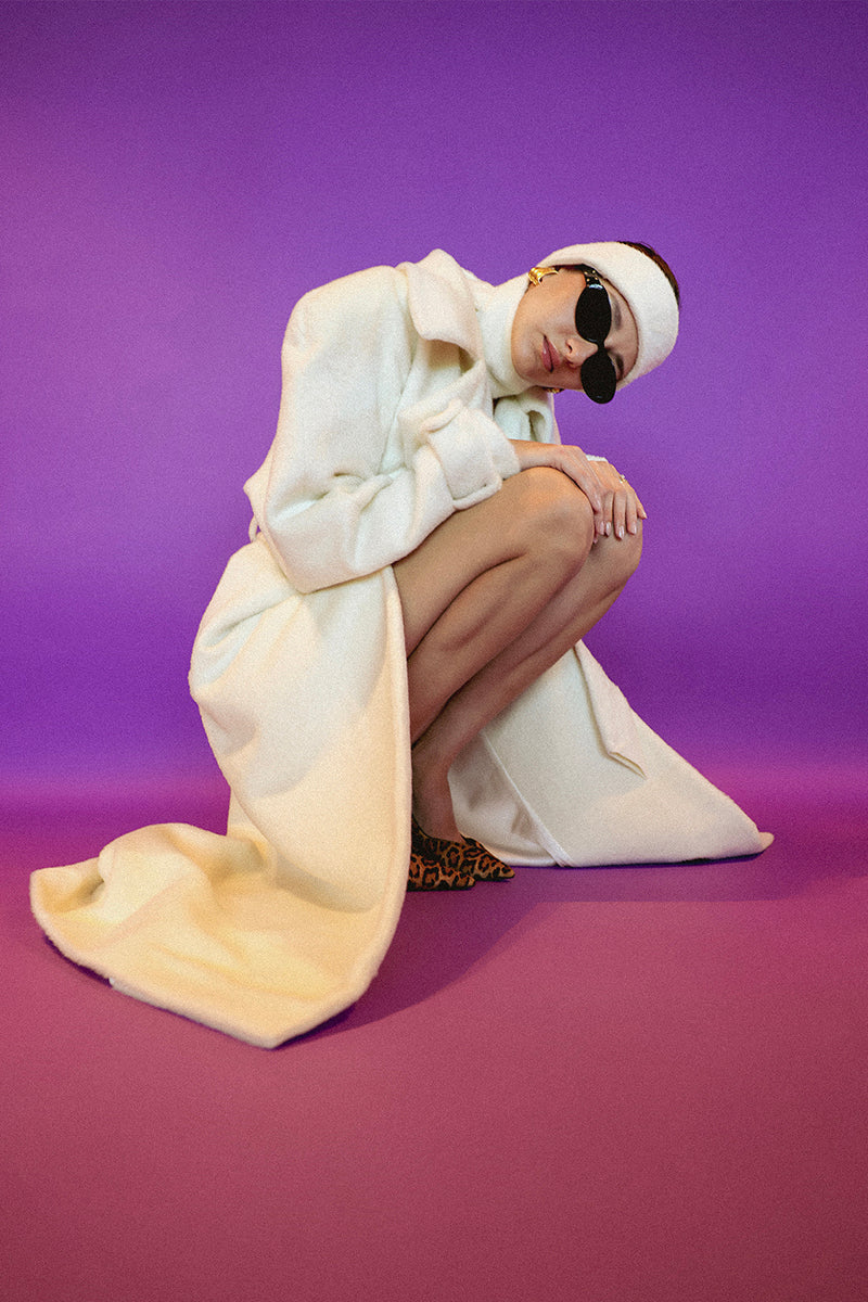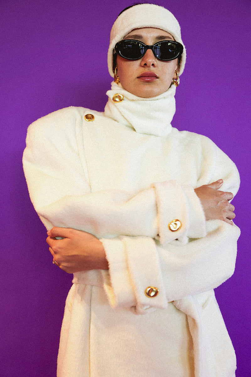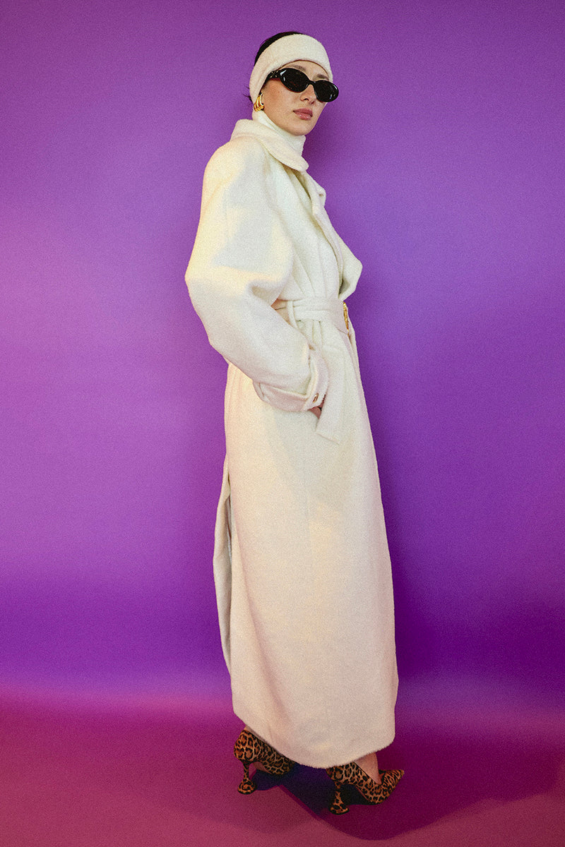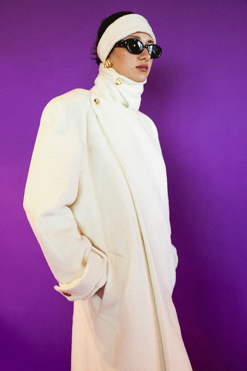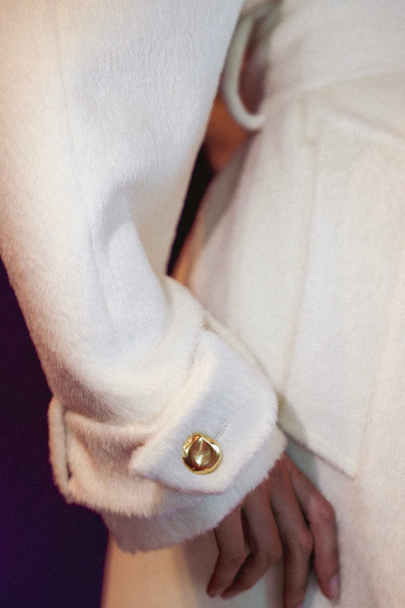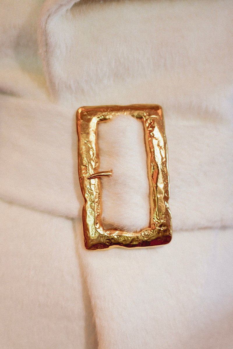 Manteau long structuré en laine blanc asperge, doté de larges cols, de boutons argentés plaqués or réalisés sur mesure, d'épaules rembourrées, de manches froncables et d'une ceinture assortie avec boucle argentée plaquée or.