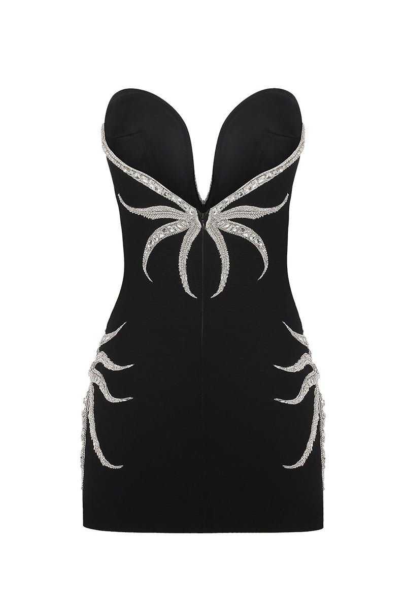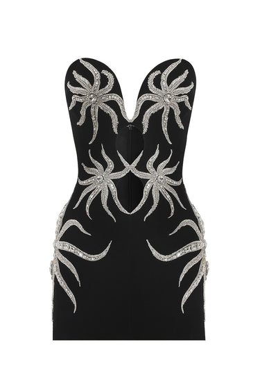 Robe courte en velours noir, bustier et découpes sur le devant. Entièrement brodée à la main de perles argentées, elle crée une silhouette audacieuse et sculptée.