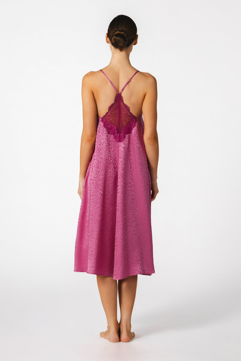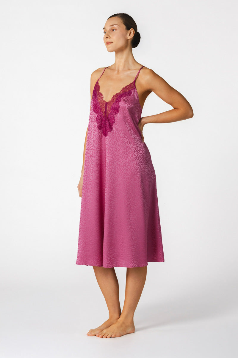 Elevate your travel wardrobe with the Sydney A-Line Long Gown, a piece designed to accompany you on memorable escapes. Crafted in silk jacquard featuring a subtle leopard pattern in feline Freesia trimmed with an elusive geometric floral stretch-lace in Curacao with Azure stretch-lace. This gown is the perfect companion for your travel adventures. Pair it with the Sydney Long Robe to create an effortlessly elegant ensemble, no matter where your journey takes you.