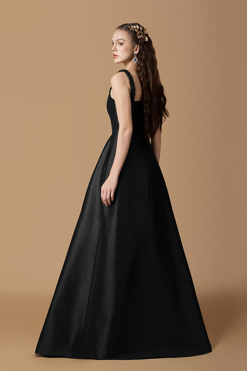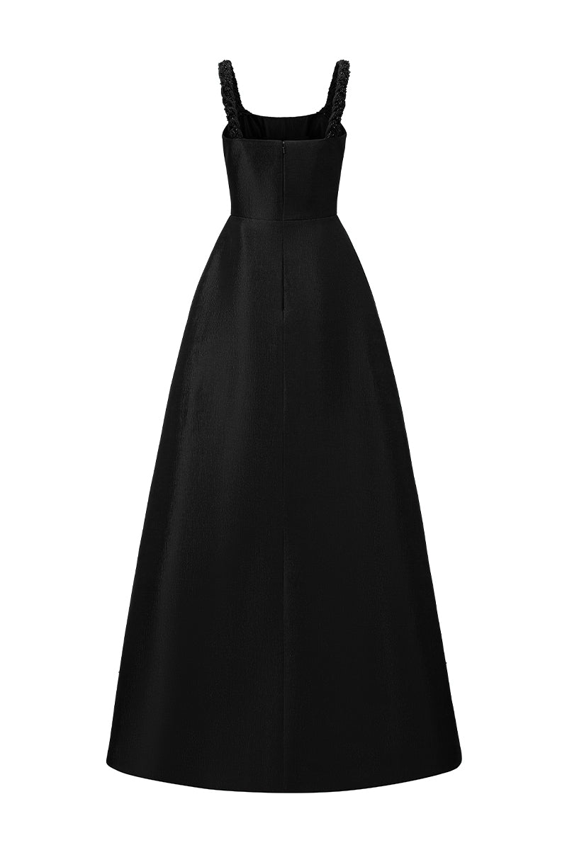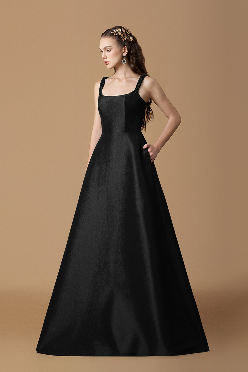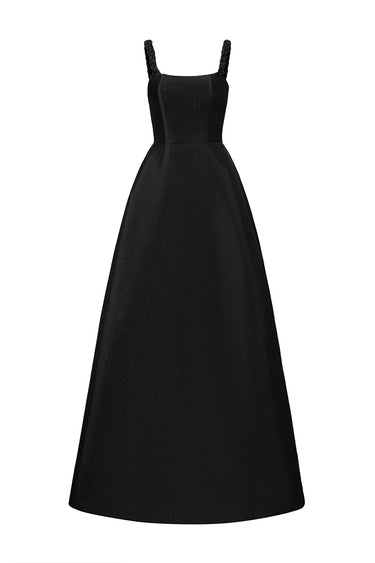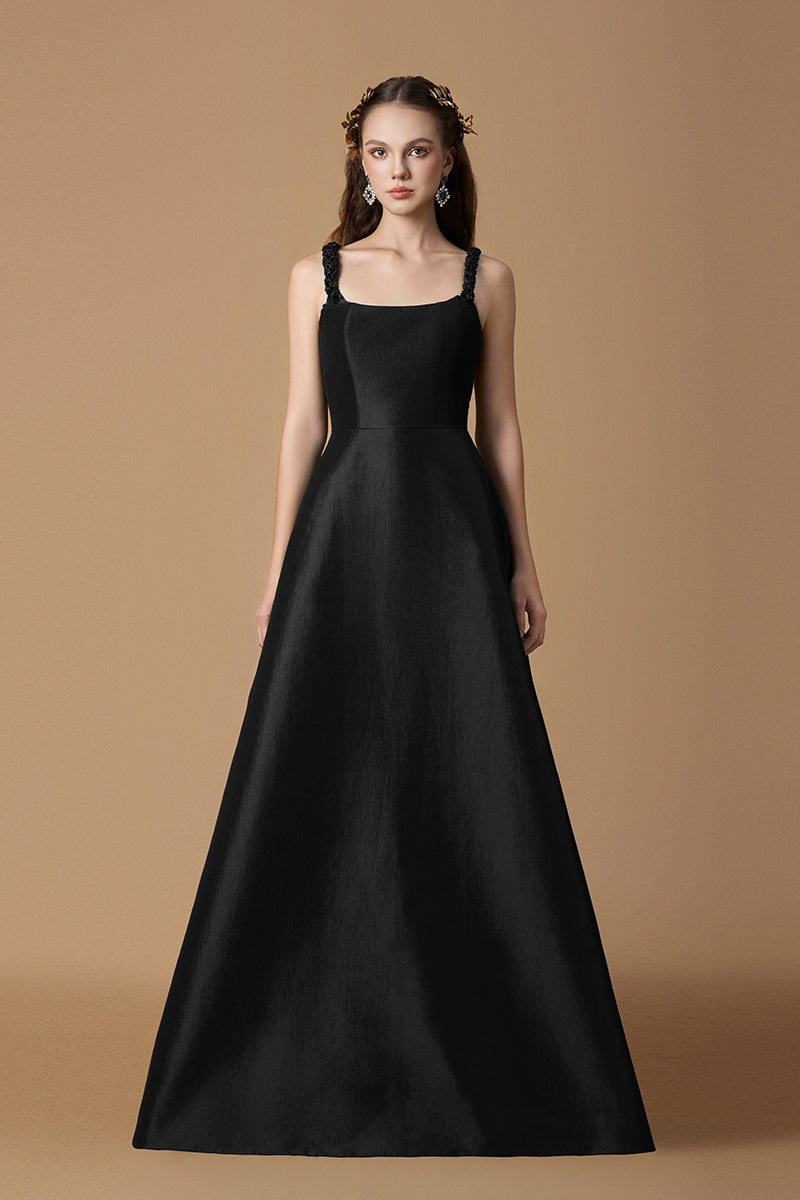 Cette robe trapèze en taffetas doublé de soie révèle une fusion raffinée de savoir-faire et d'élégance. La bretelle tressée à la main ajoute une touche artisanale, tandis que les délicats ornements en cristal captent la lumière avec un luxe discret. Fluide et élégante, de son corsage ajusté à son ourlet gracieux, cette pièce incarne une sophistication intemporelle et une allure moderne.