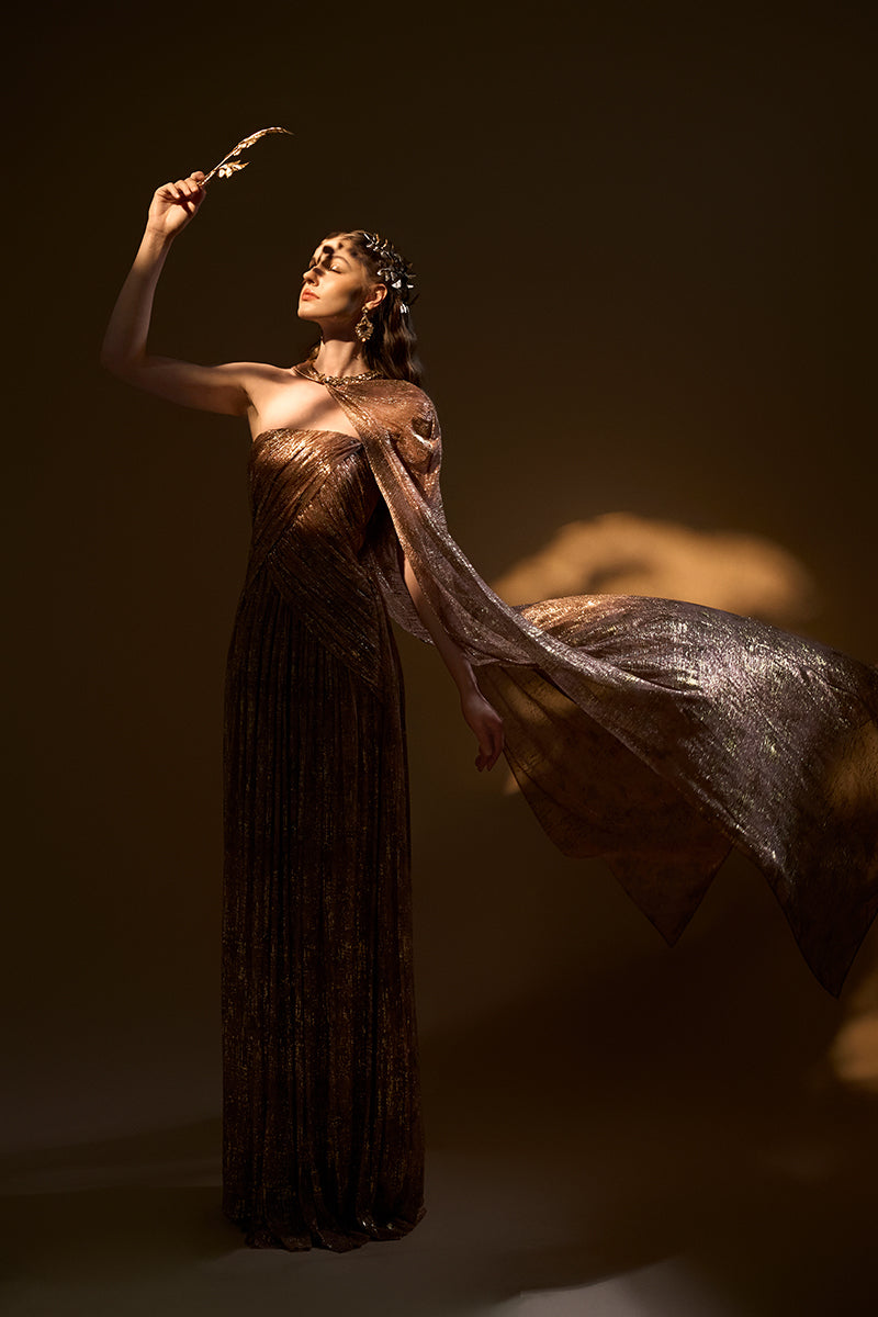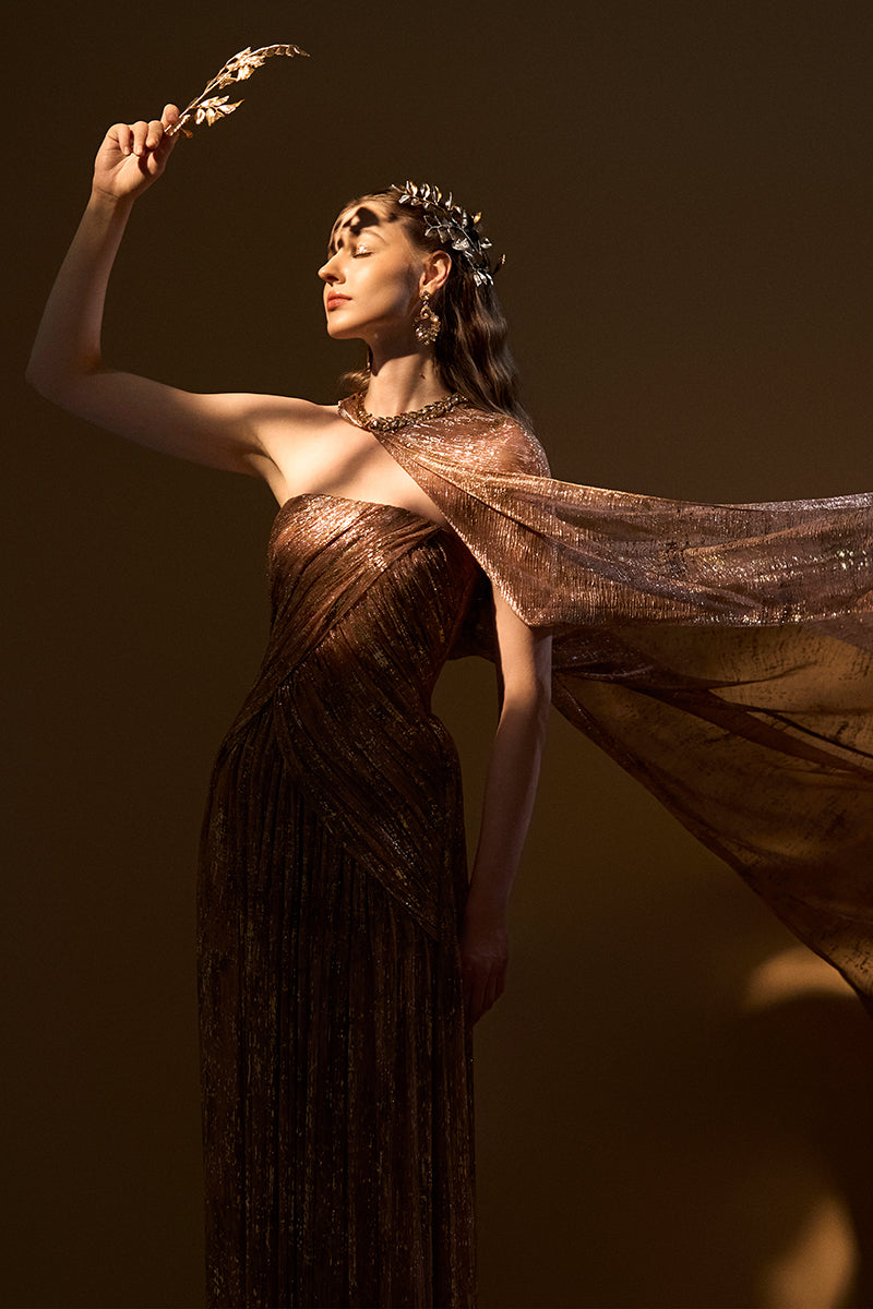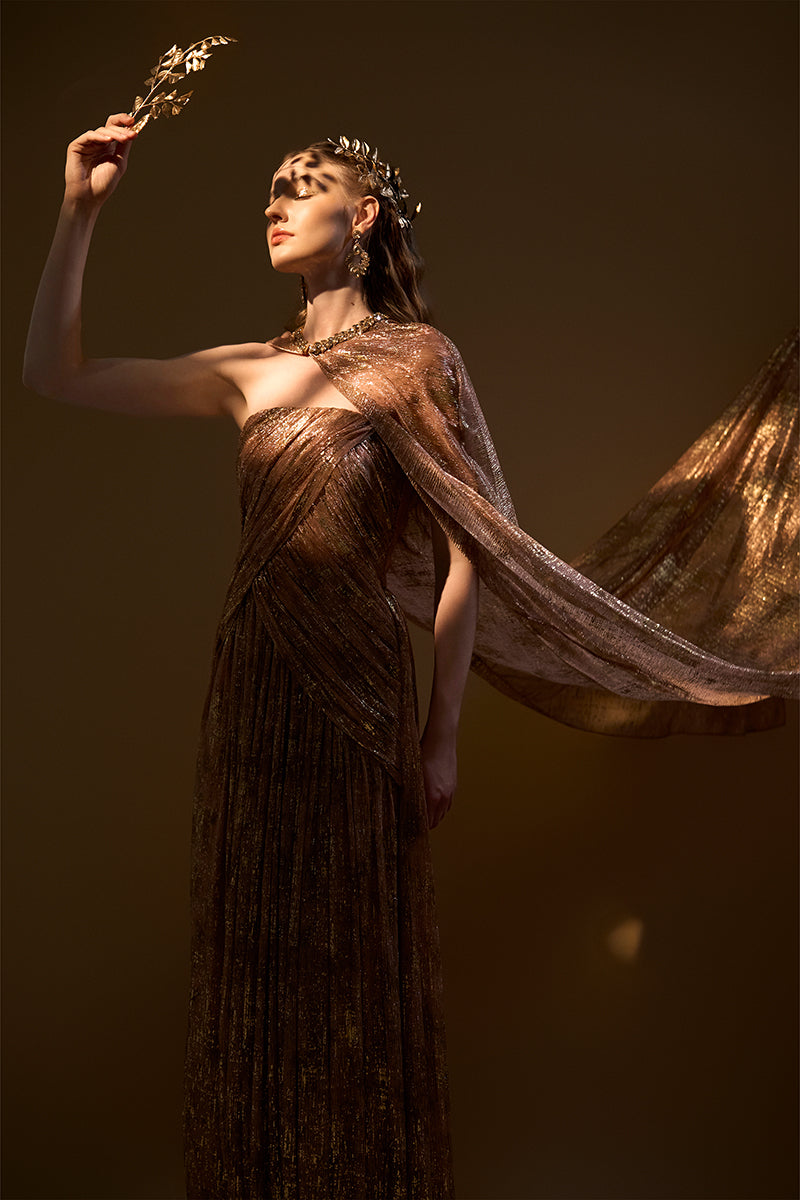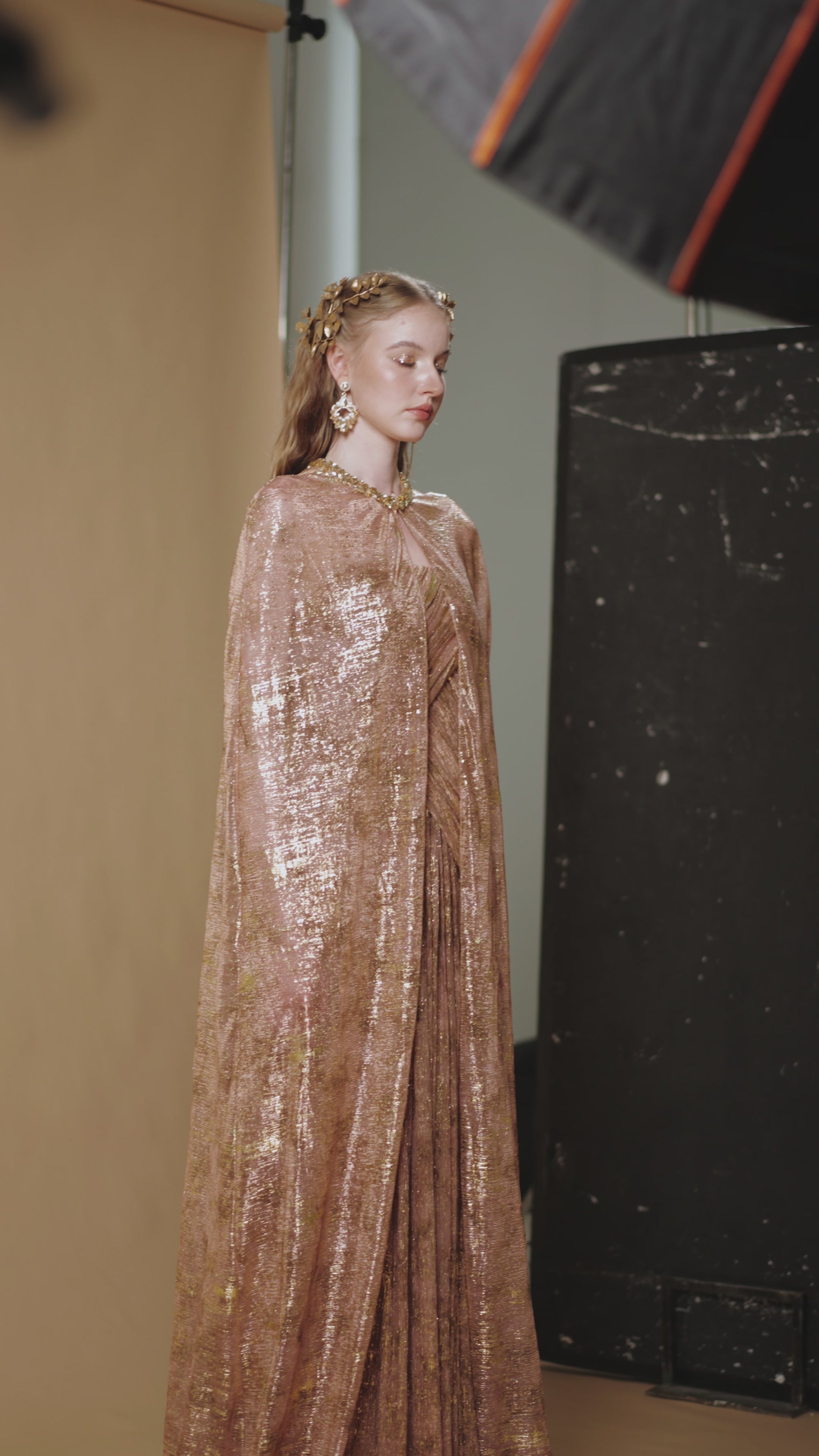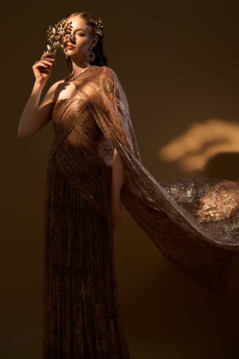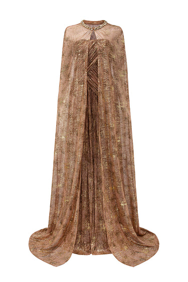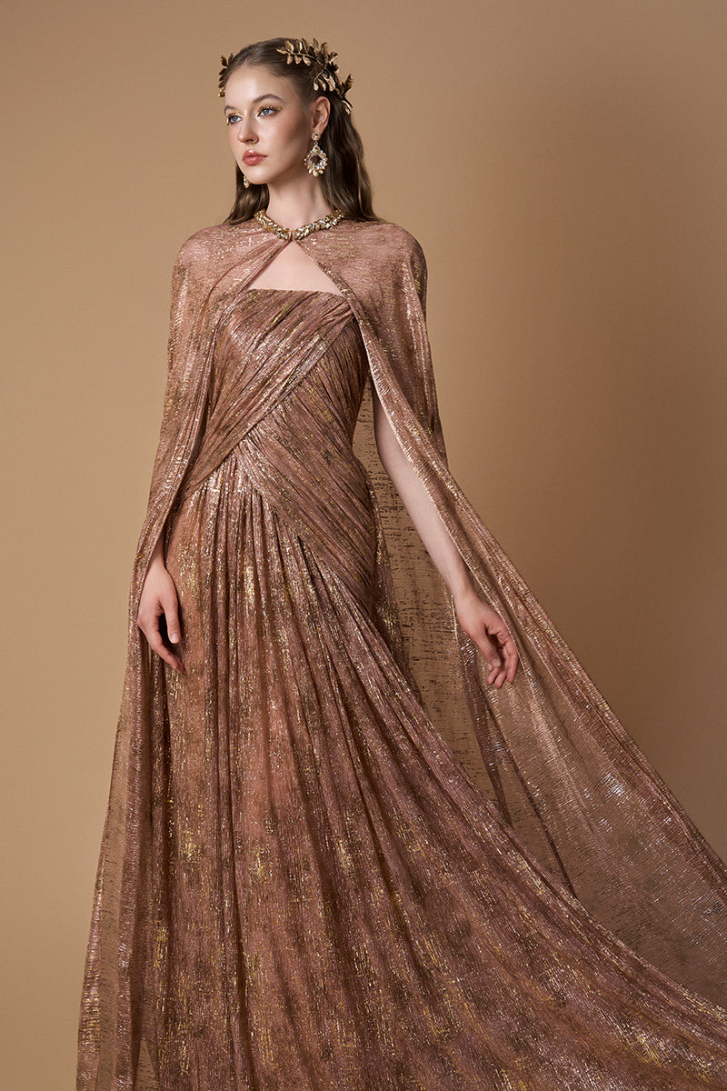 La robe bustier trapèze à longue cape en mousseline métallisée tie-dye rayonne d'une opulence moderne grâce à son corsage bustier sculpté et sa jupe trapèze fluide. Confectionnée en mousseline métallisée vert doré aux délicats dégradés tie-dye, elle tombe avec grâce jusqu'au sol, reflétant des nuances bronze et perle à chaque mouvement. Une longue cape ondule élégamment depuis les épaules, son décolleté illuminé par des pierres serties à la main pour une touche de sophistication lumineuse.