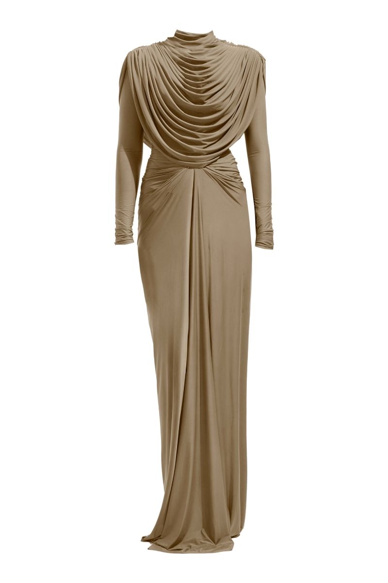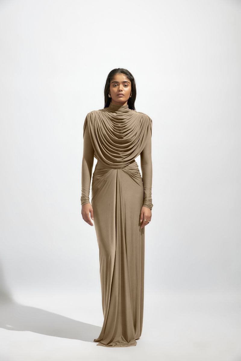 Cette robe luxueuse présente des manches amples, avec des cols élégants en haut et un drapé gracieux en bas.