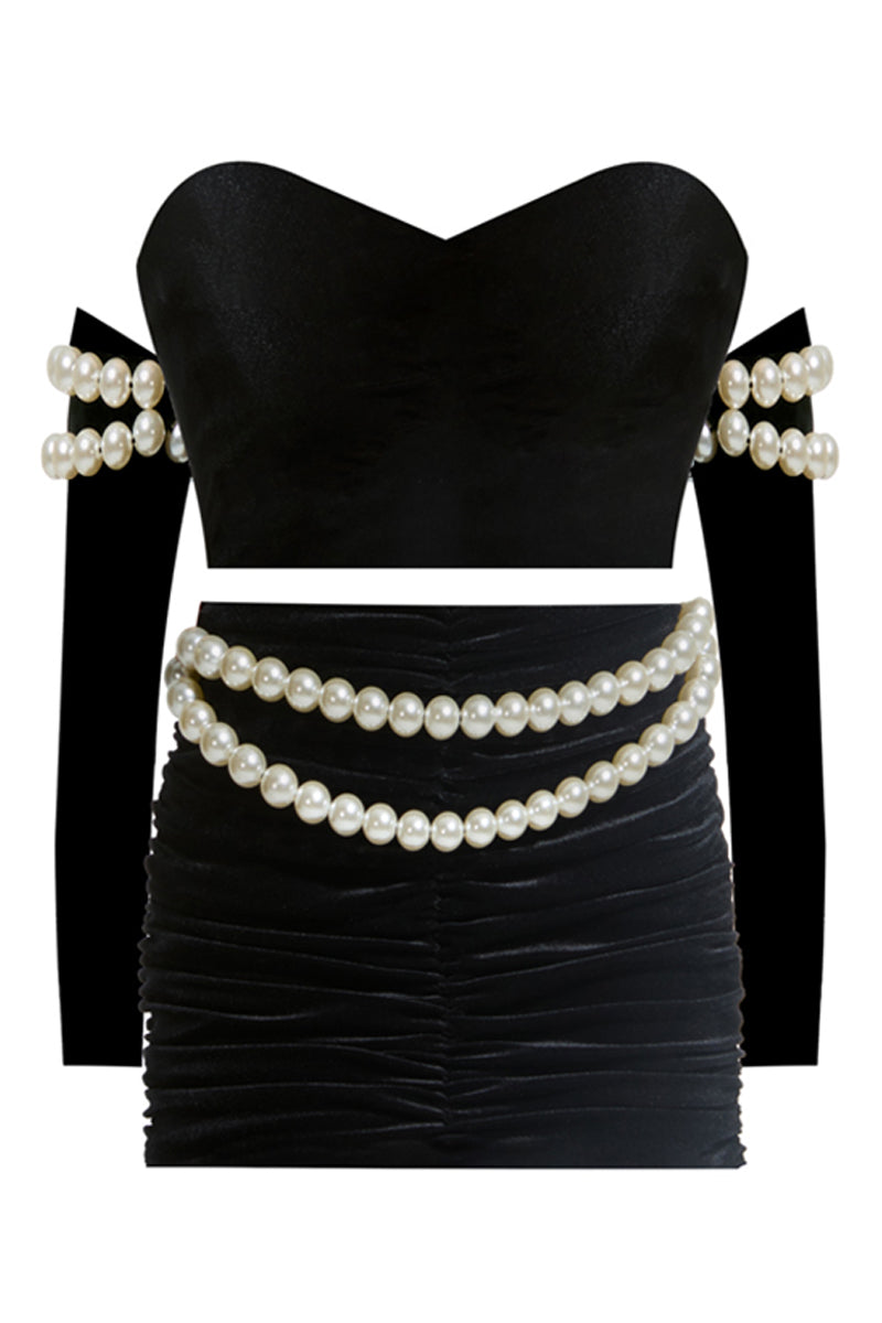 - Un haut bustier en velours et une mini-jupe avec une ceinture de perles