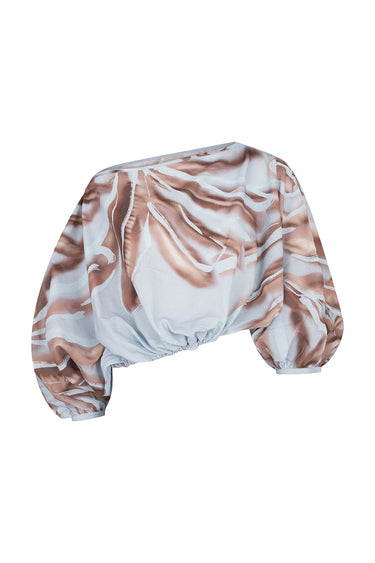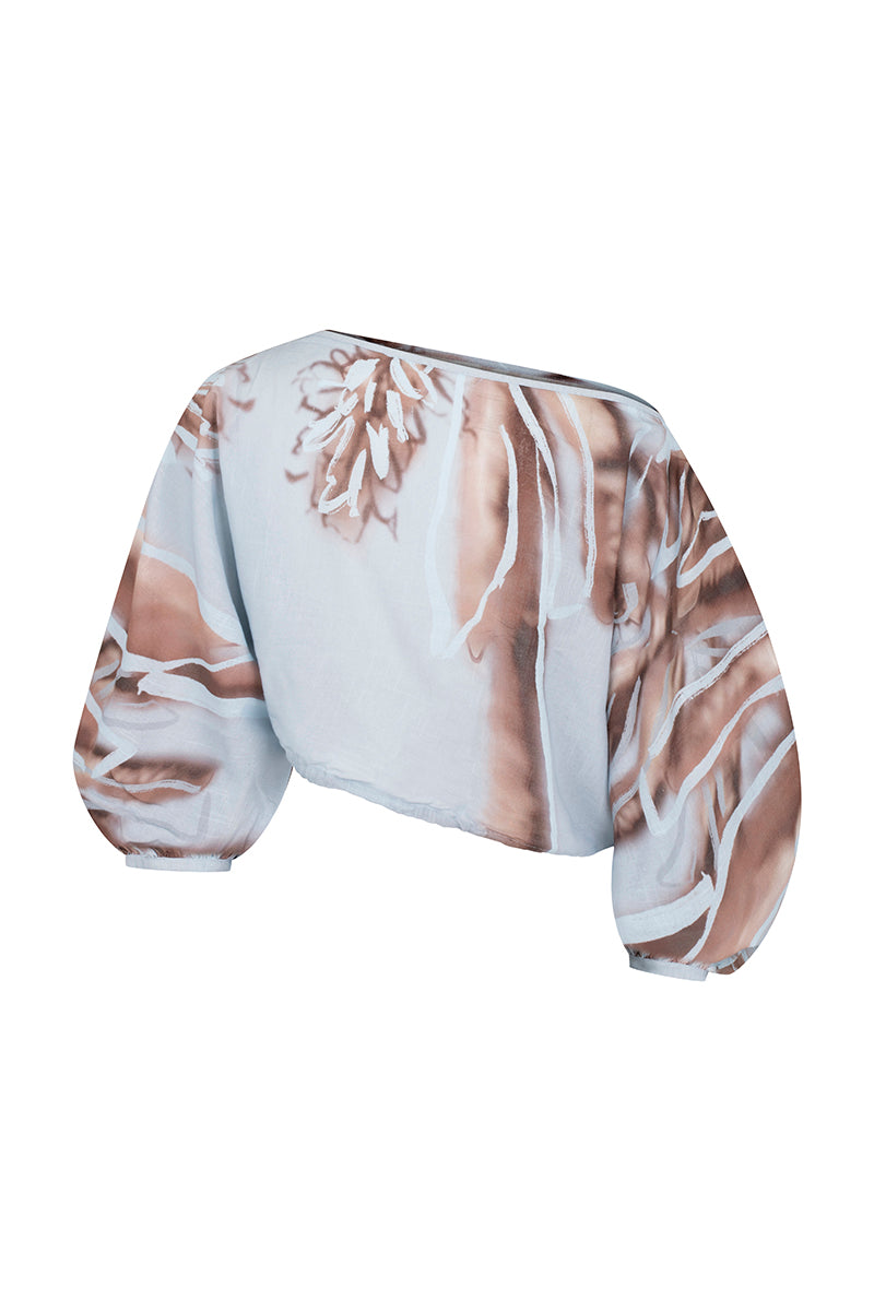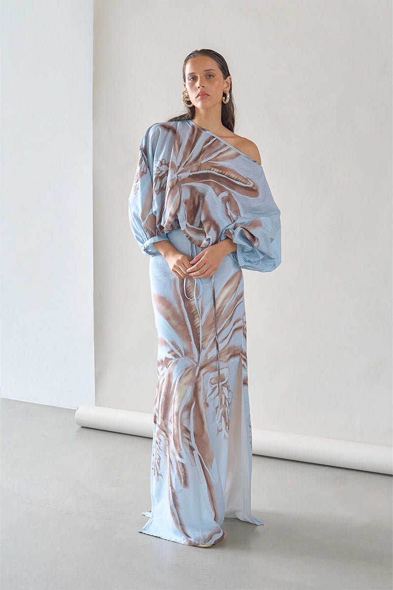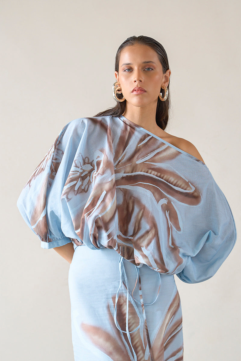 Un chemisier asymétrique au drapé fluide et aux manches bouffantes volumineuses. Portez-le sans effort avec une jupe ou un pantalon assorti pour un look coordonné, ou portez-le comme un haut affirmé pour sublimer des pièces minimalistes.