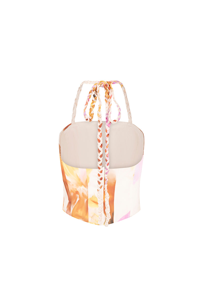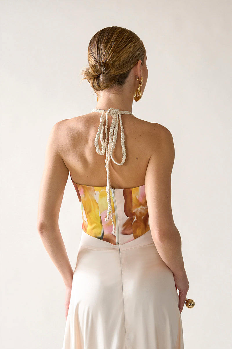 Ce haut dos nu à encolure droite et bretelles tressées se nouant dans le dos. Conçu avec un corsage ajusté et un dos nu, il allie structure et fluidité.