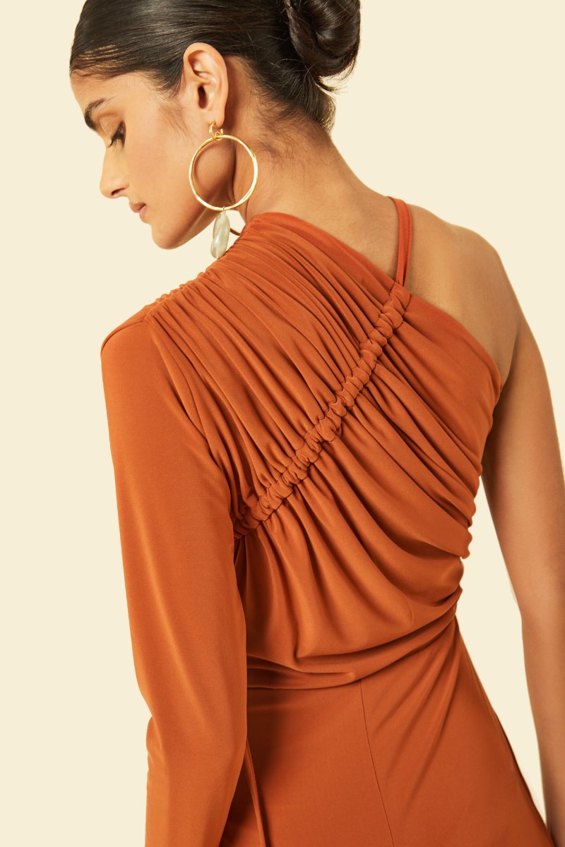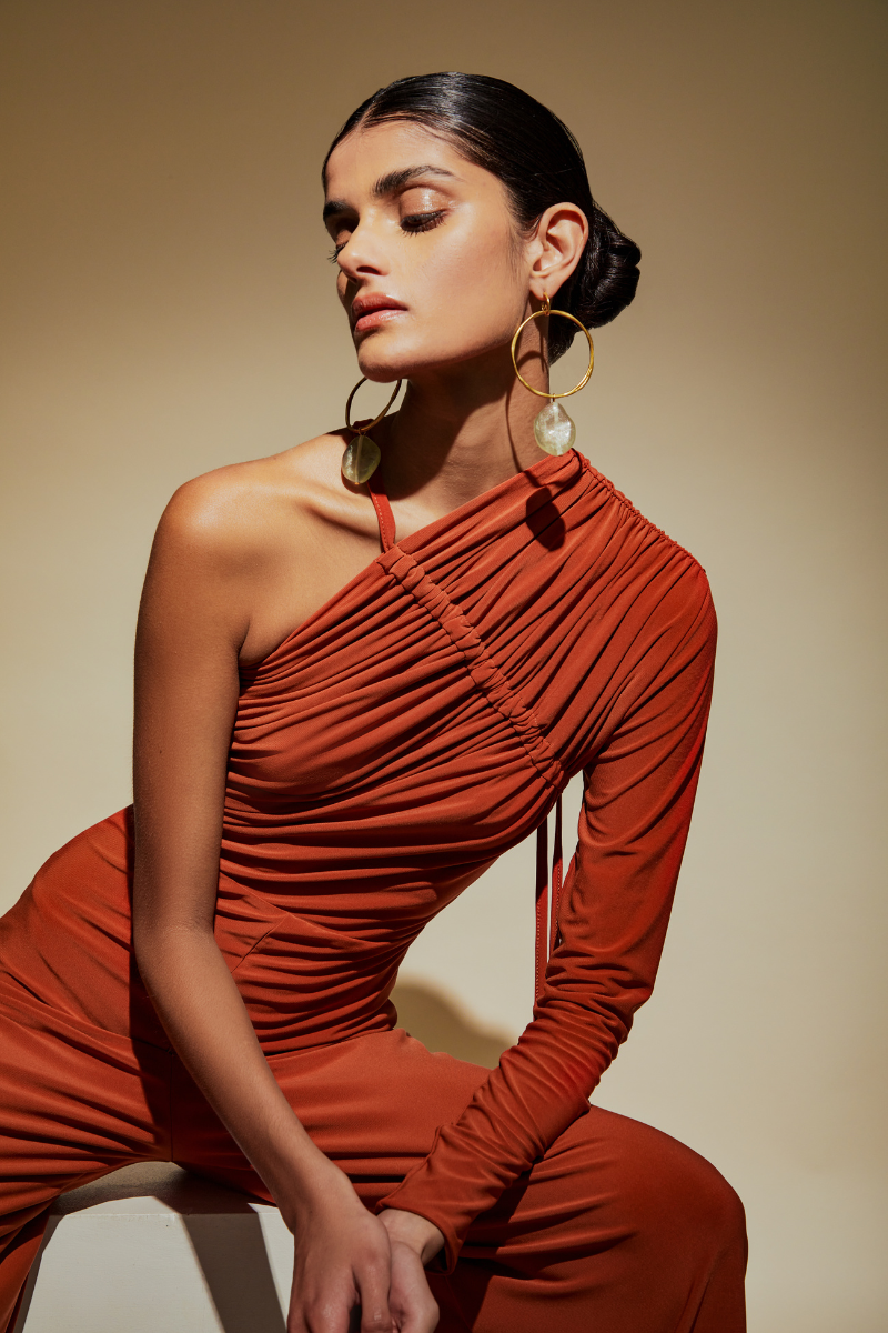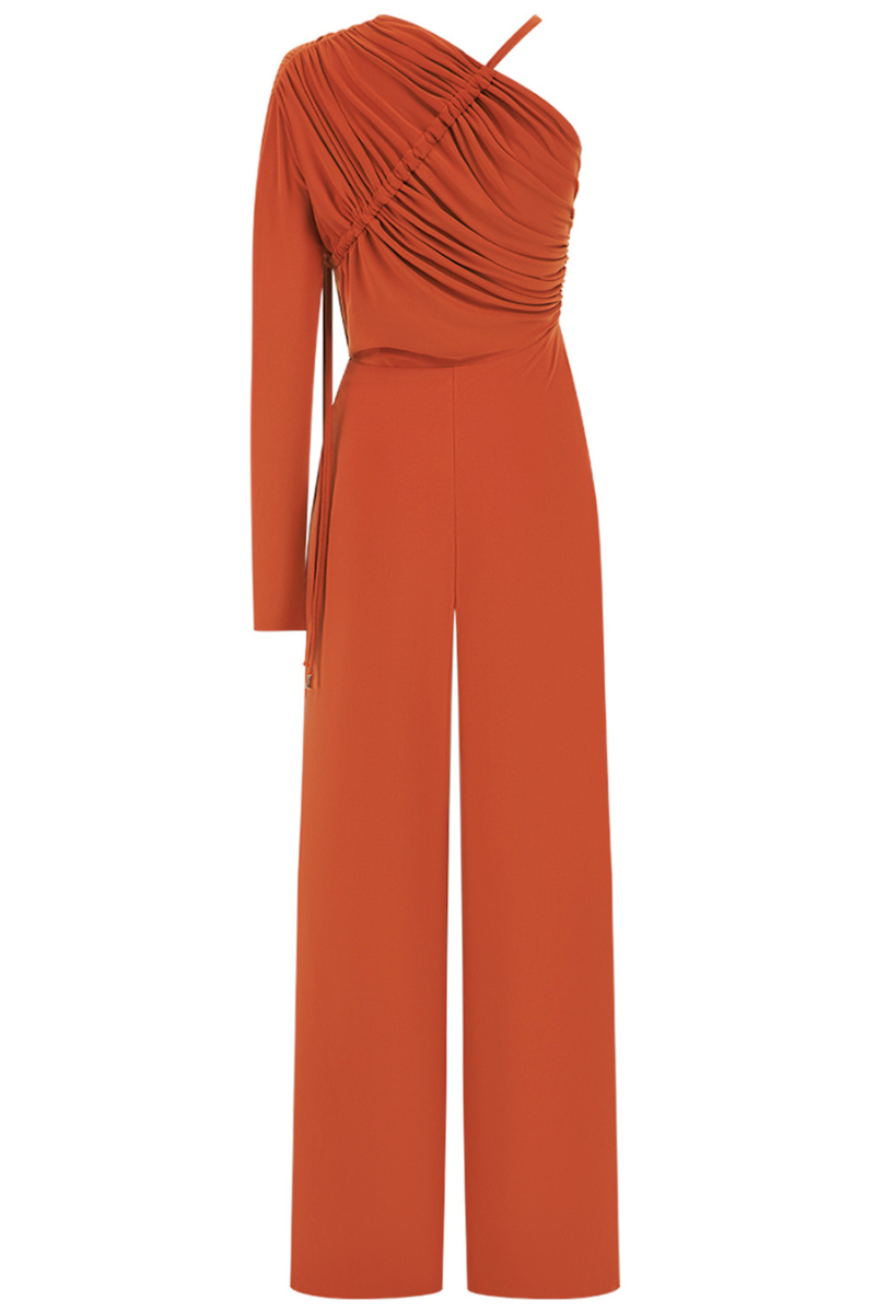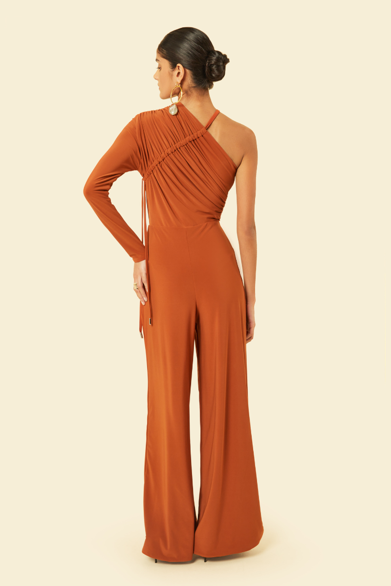 La combinaison Ivy respire une féminité puissante avec un design à une épaule, des détails froncés exagérés sur le corsage et une finition avec un pantalon large, créant une pièce qui définit le modernisme.