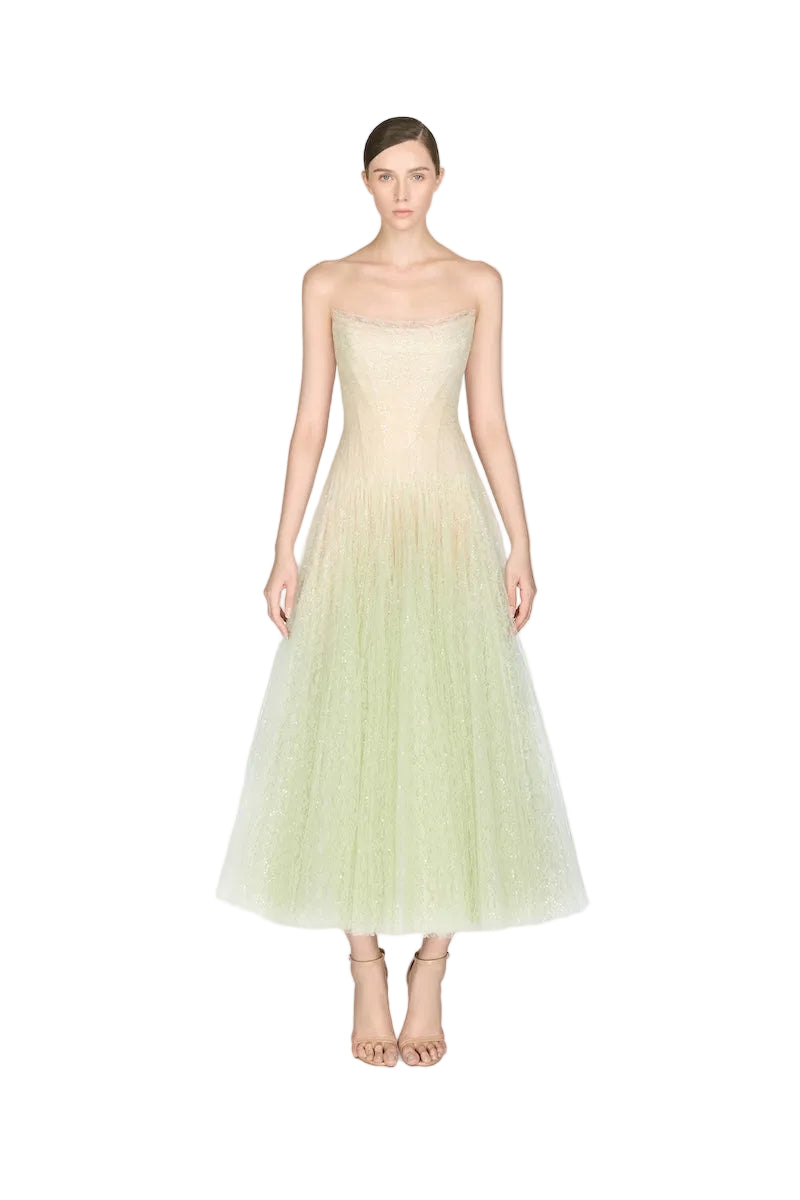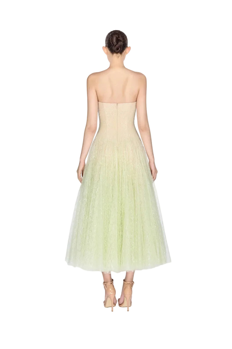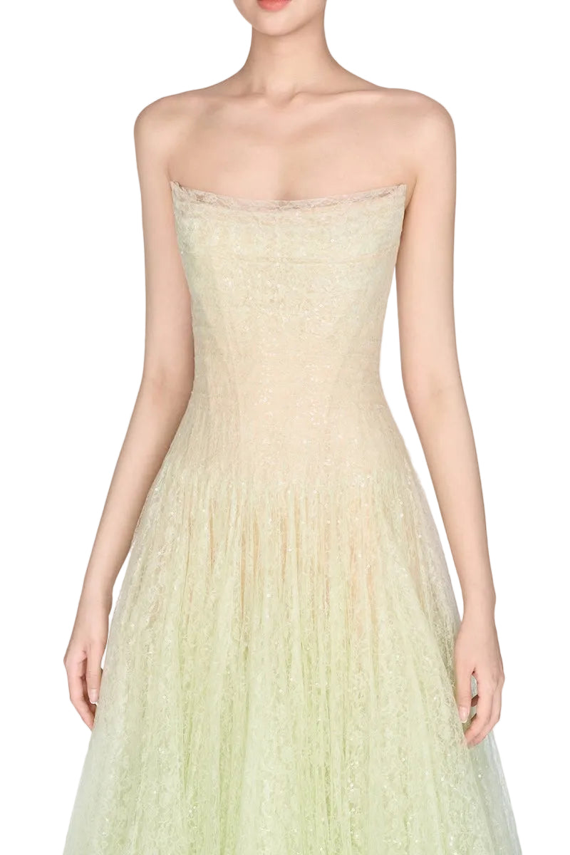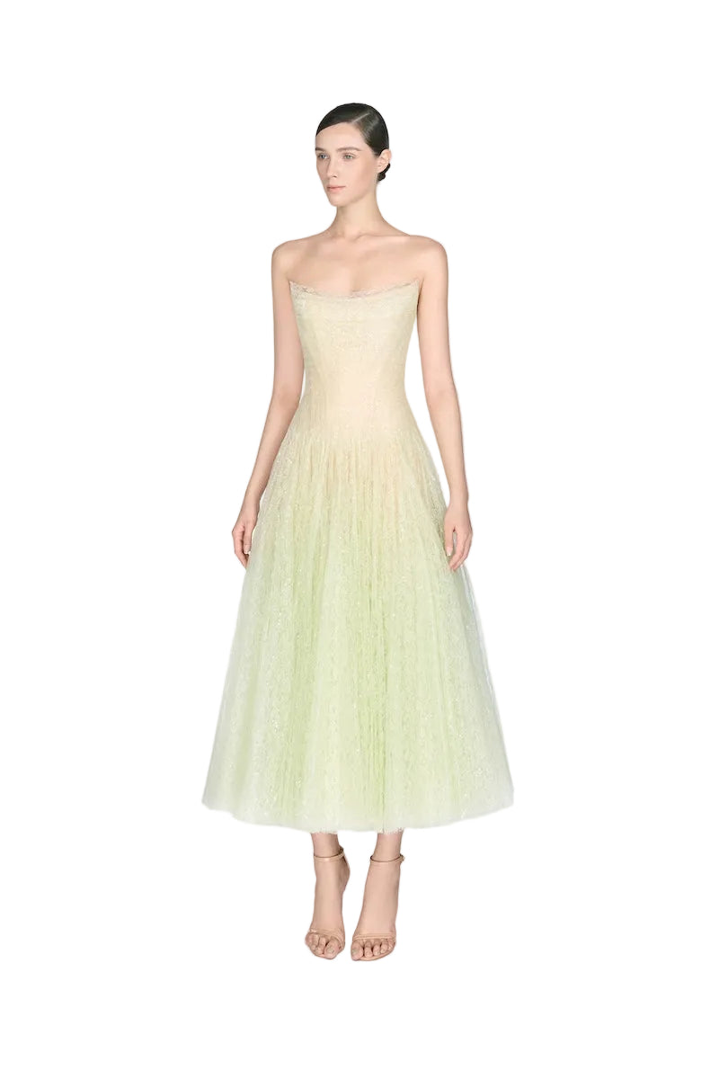 Robe mi-longue drapée en dentelle menthe