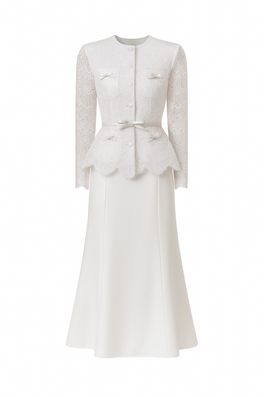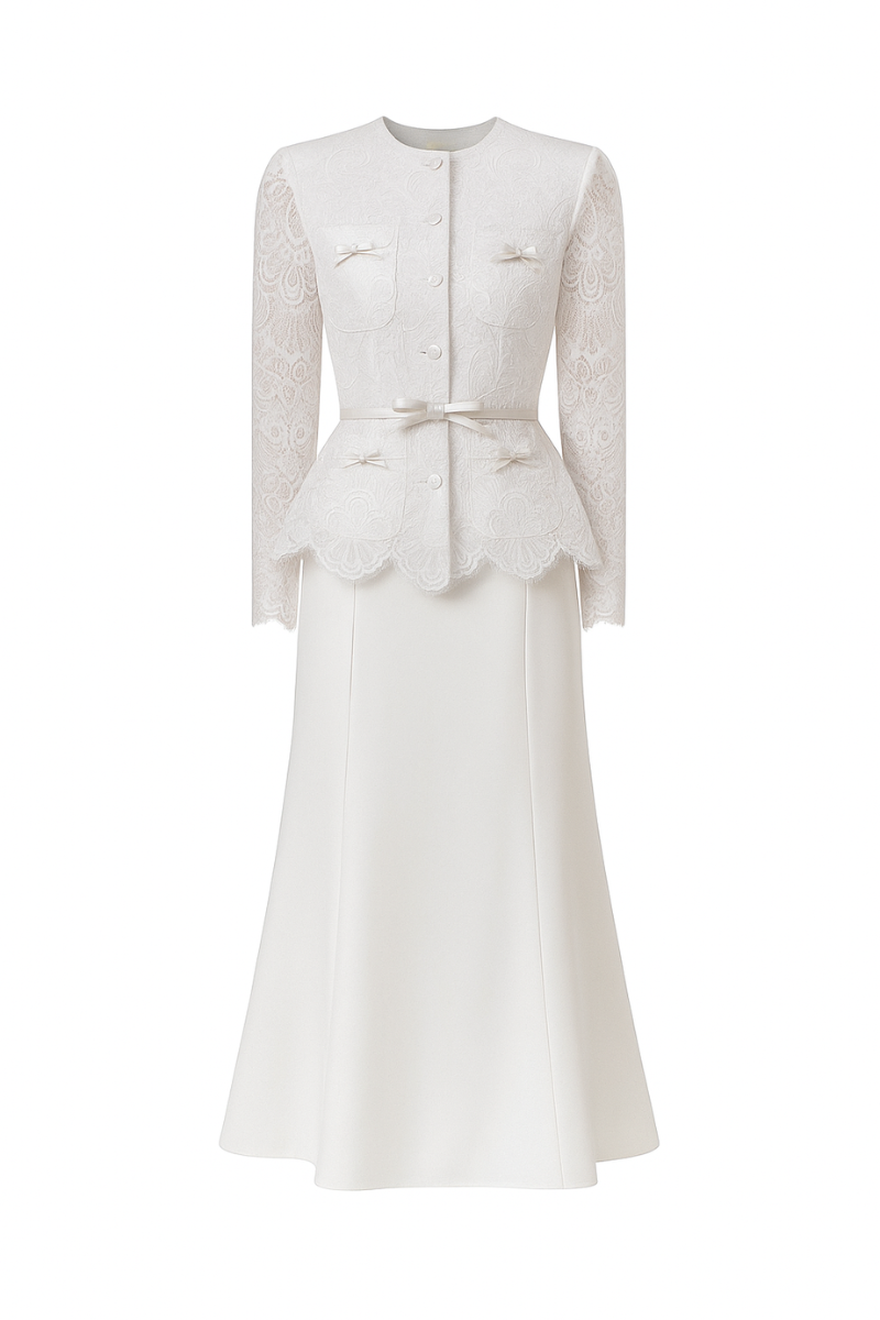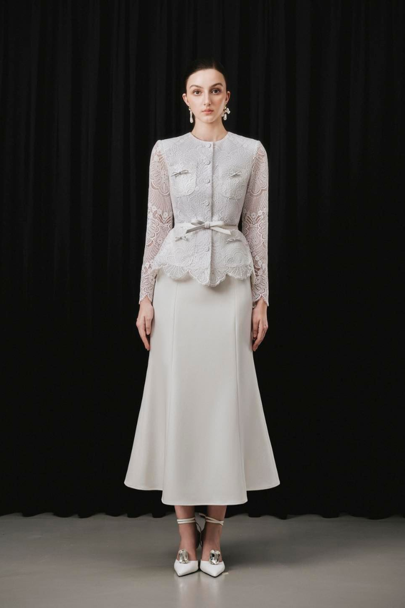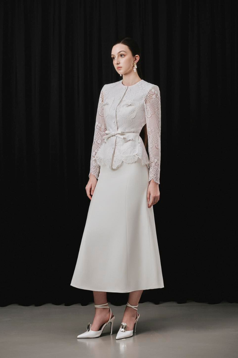 - Associé à une jupe trapèze élégante en crêpe ivoire assorti