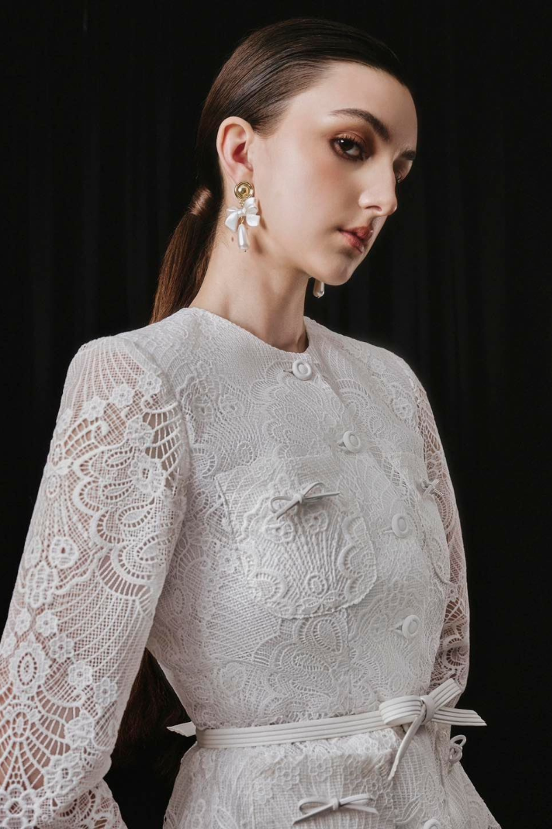 - Veste en dentelle ivoire avec des bords festonnés délicats et des manches longues transparentes