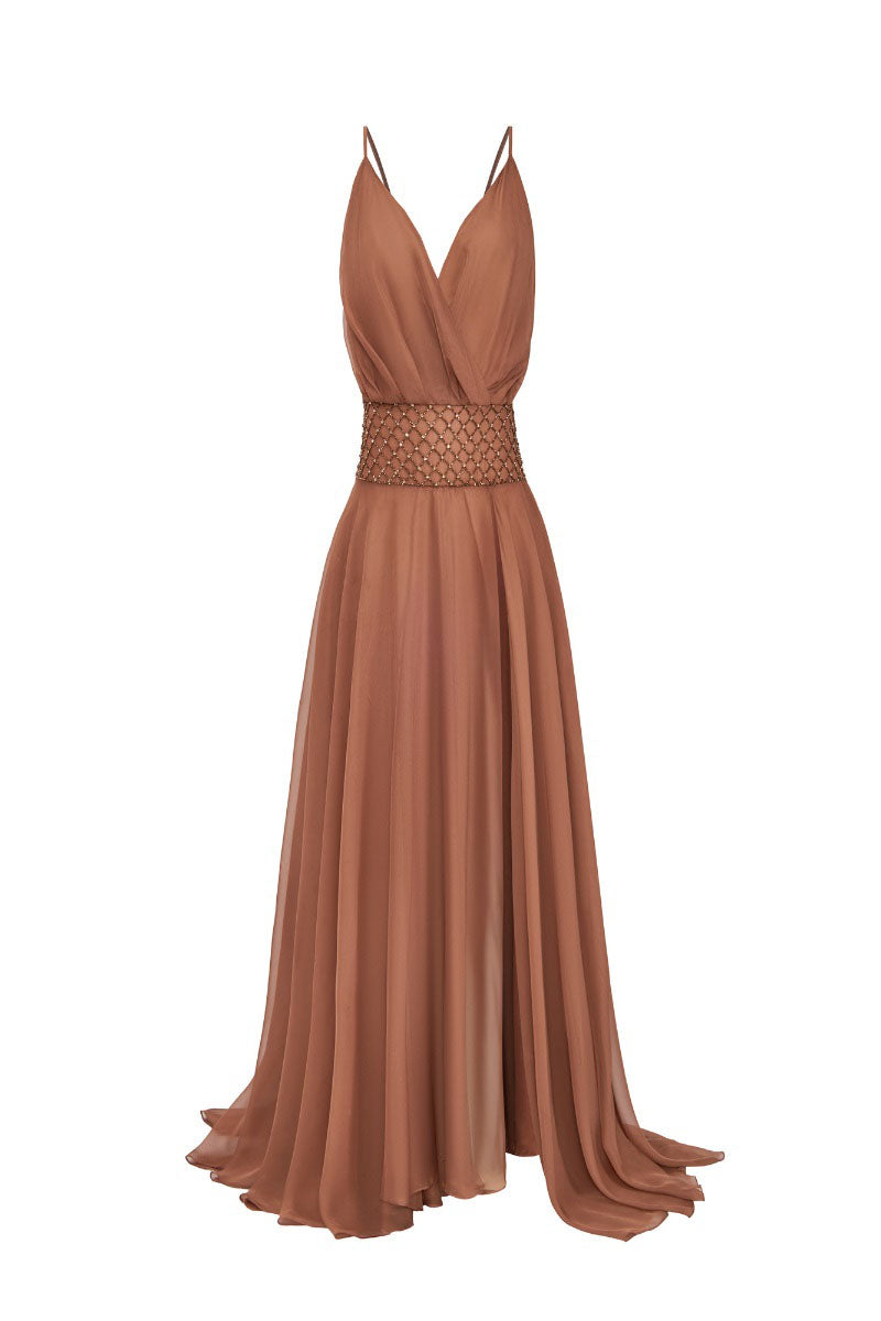 Robe longue marron en mousseline à double épaisseur