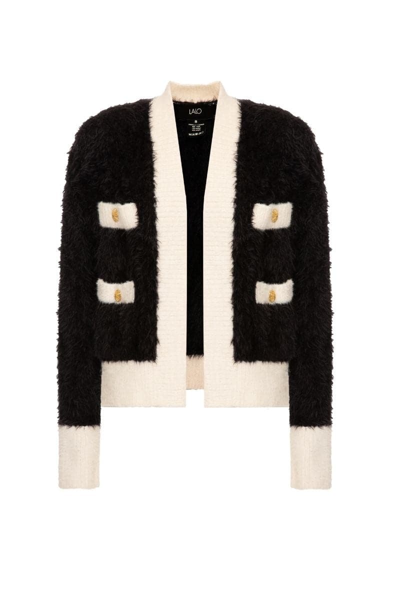 Un cardigan noir moelleux chic aligné avec moins de peluches avec du blanc sur le devant et du blanc dans les poches. Contient des boutons dorés qui incluent le classicisme du cardigan. Offrant une combinaison intemporelle d'élégance et de luxe, ce cardigan immaculé est le choix idéal pour les amateurs de mode. Des tissus somptueux et des boutons dorés exquis créent un look sophistiqué qui respire le style.