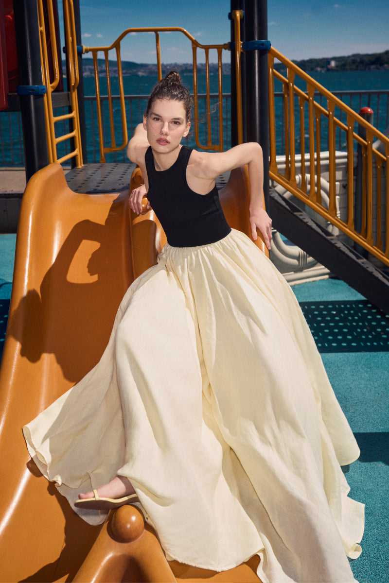 La robe longue Nikki associe harmonieusement un haut en viscose noire de qualité supérieure à une luxueuse jupe en lin jaune, créant ainsi un ensemble véritablement harmonieux. Adoptant une approche minimaliste avec des lignes épurées et des tissus de haute qualité, cette robe respire un style raffiné et classique.