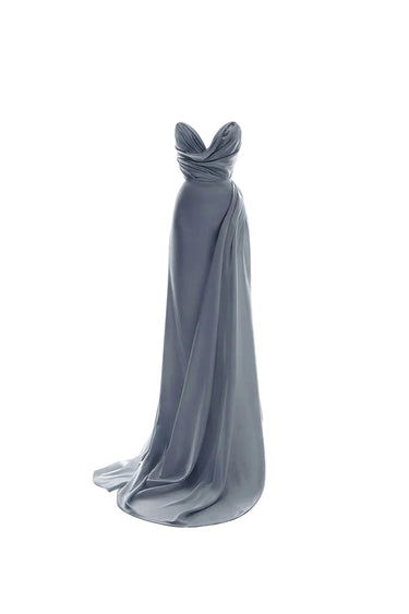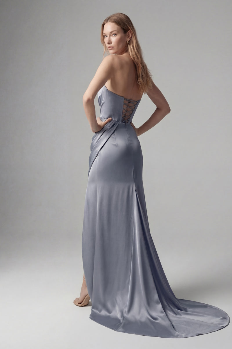 Robe en satin délicat, avec un drapé souple le long du corset et une jupe fluide et vaporeuse.