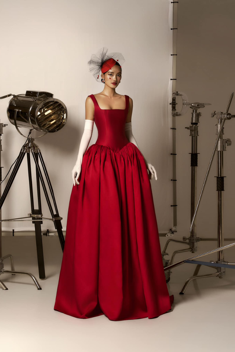 Cette robe de bal en taffetas présente des bretelles amples et une taille cintrée pour un look royal à tout événement formel.