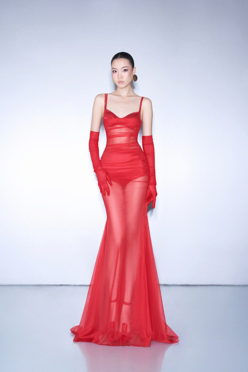 - Robe longue dos nu en mousseline rouge fluide