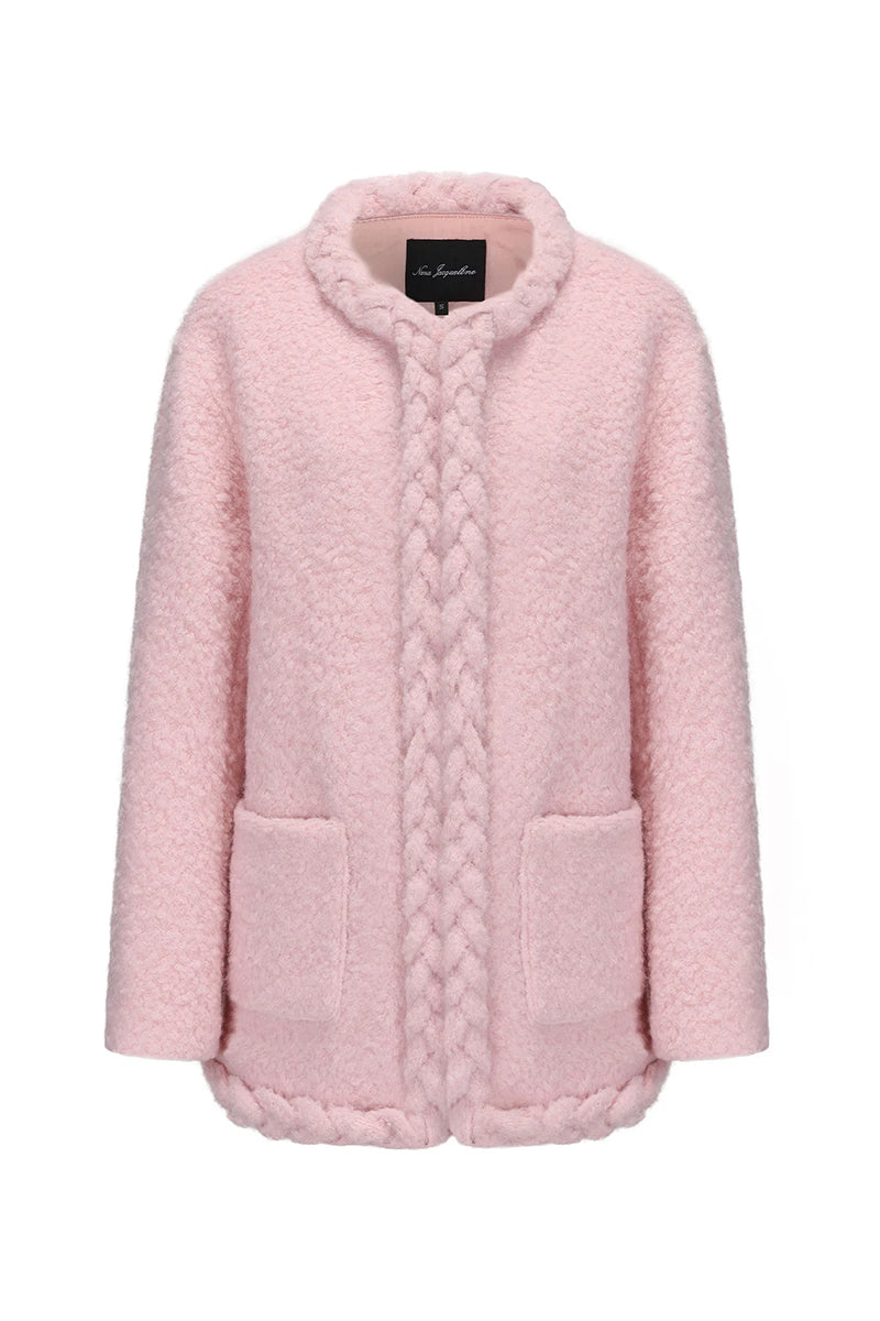 Le manteau Talia allie confort et détails chics, confectionné en tissu éponge doux pour un look à la fois confortable et élégant. Sa décoration tressée faite à la main le long de la patte de boutonnage ajoute une touche de féminité et de dimension, tandis que le design à crochet à carreaux personnalisé assure une facilité de port. Avec une silhouette ample et dénudée, ce manteau court complète sans effort une gamme de tenues. Disponible en noir, blanc et rose, il offre l'équilibre parfait entre avant-gardisme et confort.