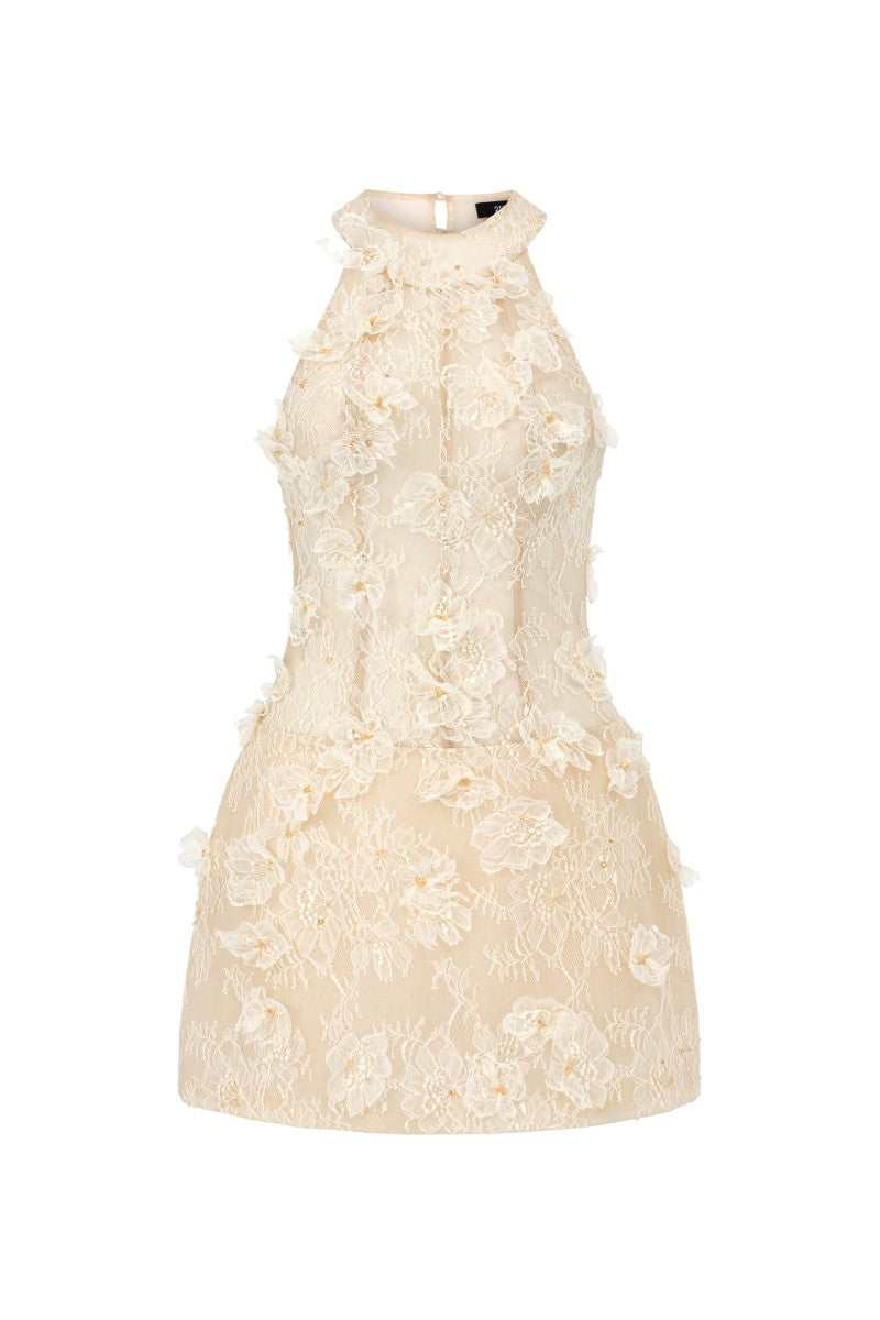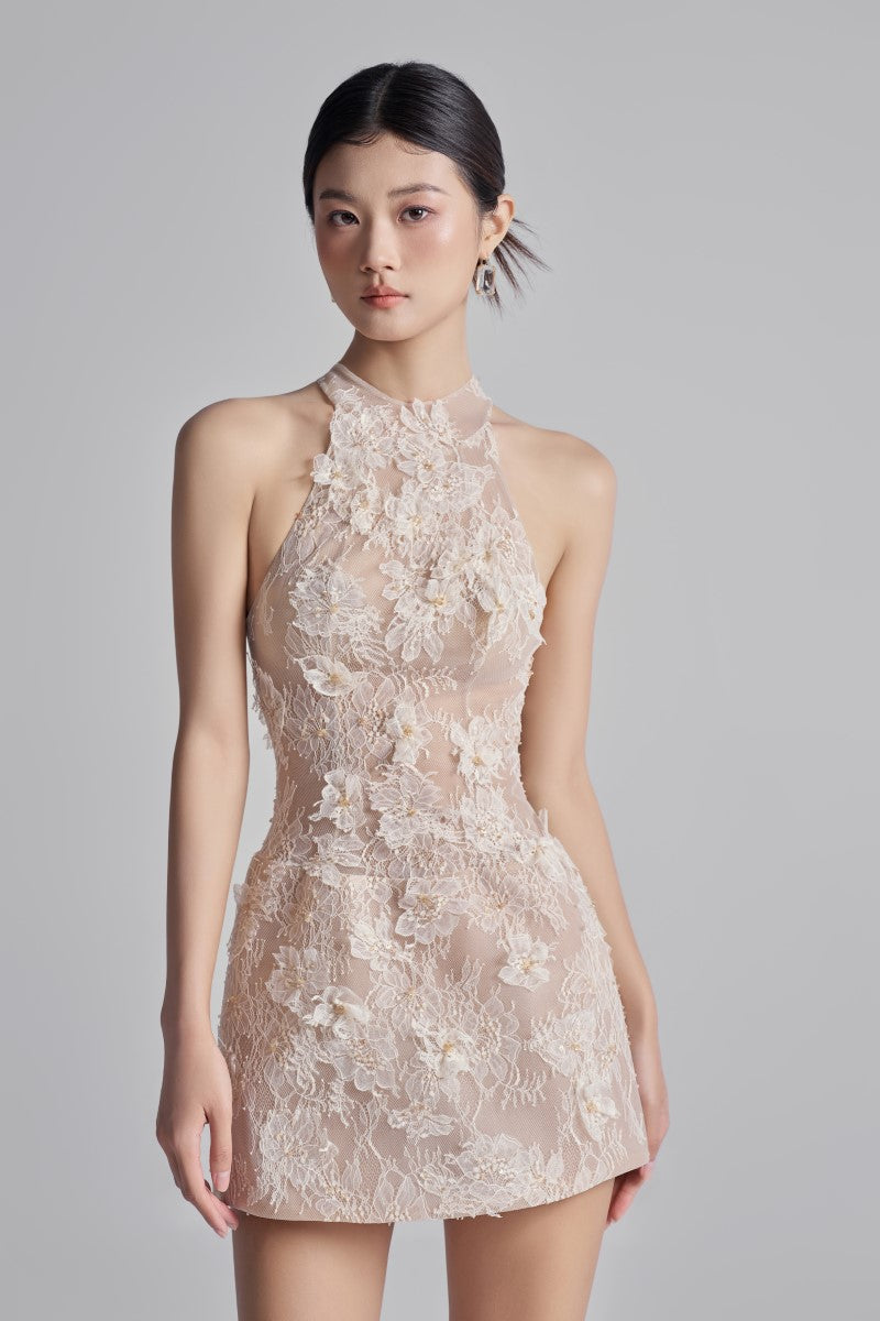 This mini dress is a blend of playful elegance and modern romance, crafted from delicate floral lace that exudes charm. The halter-style bodice and round neckline create a contemporary yet refined look, while hand-appliquéd lace flowers add rich texture and lifelike depth. Each flower is accented with subtle crystals that glisten softly, enhancing the dress’s elegance with a gentle sparkle.