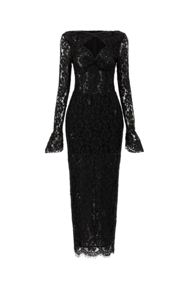 This midi dress is crafted from floral lace with a unique pattern, offering a delicate yet bold look. The figure-hugging silhouette beautifully accentuates the curves, creating an effortlessly flattering shape. Scattered sequin clusters embellish the dress, adding a hint of sparkle and further elevating the overall elegance of the piece.