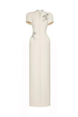 This sophisticated cream-colored dress channels modern refinement with its clean lines, tailored structure, and subtle embellishments. The high mandarin collar and short sleeves lend it an air of formality, while the form-fitting silhouette softly hugs the body before falling straight to a midi hem. Intricate crystal floral appliqués are thoughtfully placed at the shoulder and hip, drawing attention to the natural curves and adding a delicate touch of glamour. A vertical seam down the center enhances the elongating effect and reinforces the minimalist elegance. This dress blends contemporary minimalism with timeless couture sensibility.