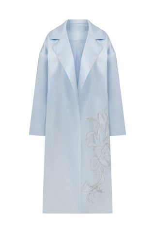 This flowing pastel blue coat features exquisite silver floral embroidery along its side, adding a touch of artistic femininity. The oversized silhouette lends itself to various styles; pair it with a crisp white blouse and tapered trousers for a sophisticated day look, or drape it over a sleek dress with bold red heels for a standout evening ensemble.