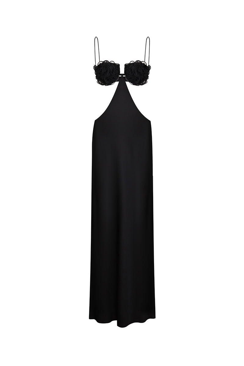 Everlyn Maxi Dress features a satin skirt and bustier base with a special cut-out complemented by double embroidered flowers on the top. The bustier is secured with hooks, while the satin lining of the skirt adds a luxurious touch.