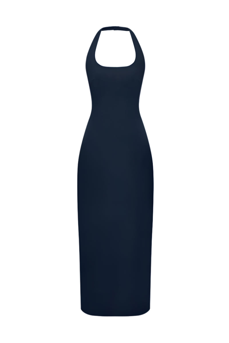This reversible dress in dark blue combines style and functionality. One side features smooth leather for a bold look, while the other is suede for a softer, more understated appearance. The halter strap highlights the shoulders and draws attention to the upper body.