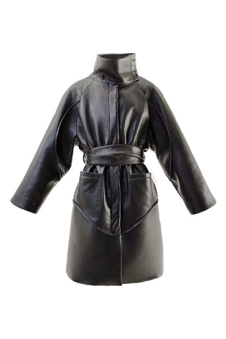 A high-neck black faux leather trench coat featuring exposed stitches, a waist ribbon, and both belted and snap-button closures. The loose style is complemented by wide sleeves and shoulder pads.