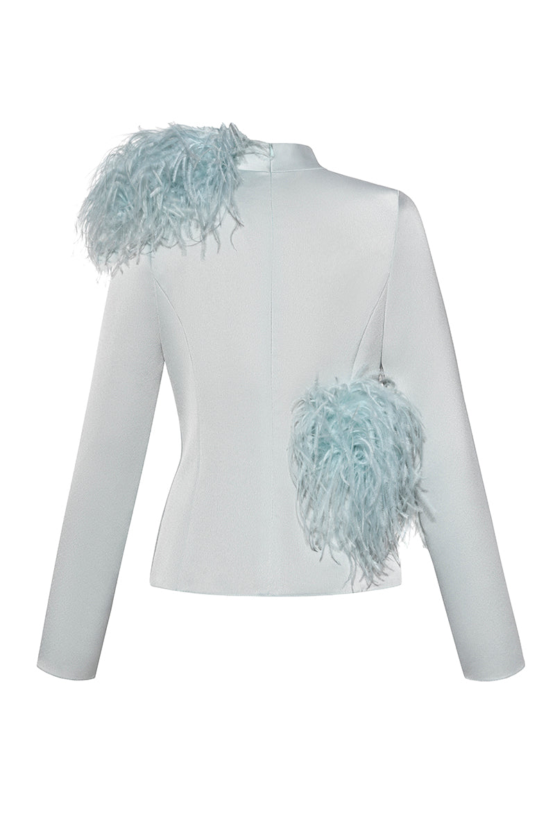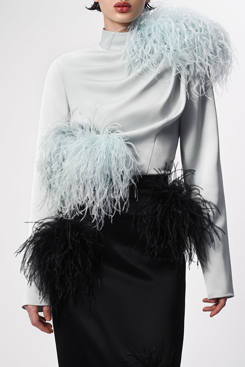 high neck top with feather detials in sky blue