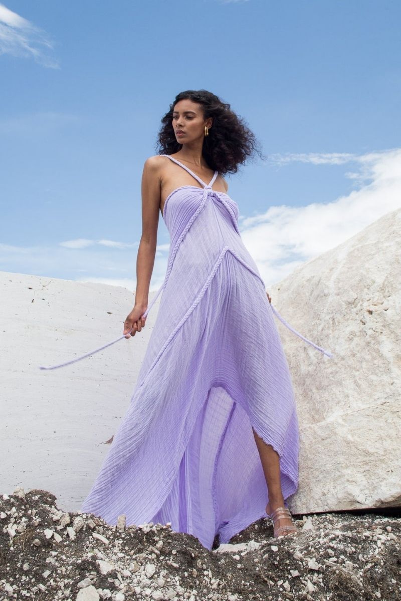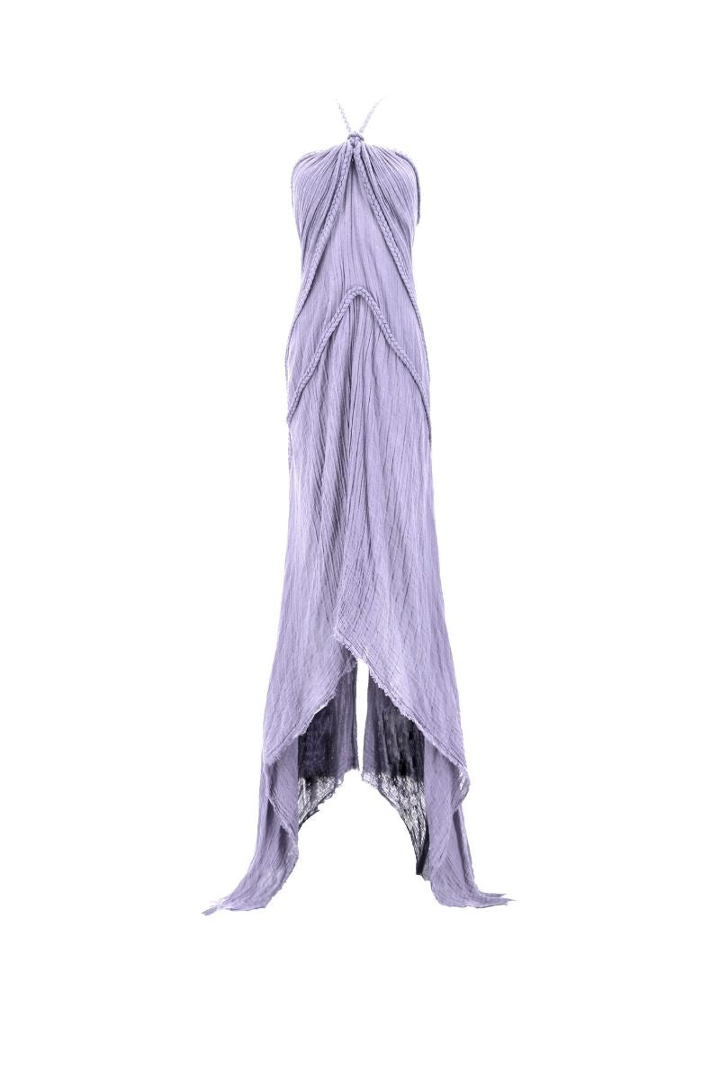 Perfect for day-to-night! This 70’s-inspired bias slip dress has a halter silhouette and hi-low mermaid hemline. Our signature cascading hand-braided details encourage the wearer to play and style and belt this breezy dress to create a flawless silhouette.