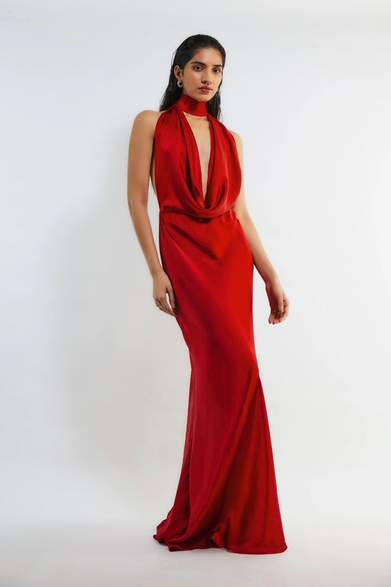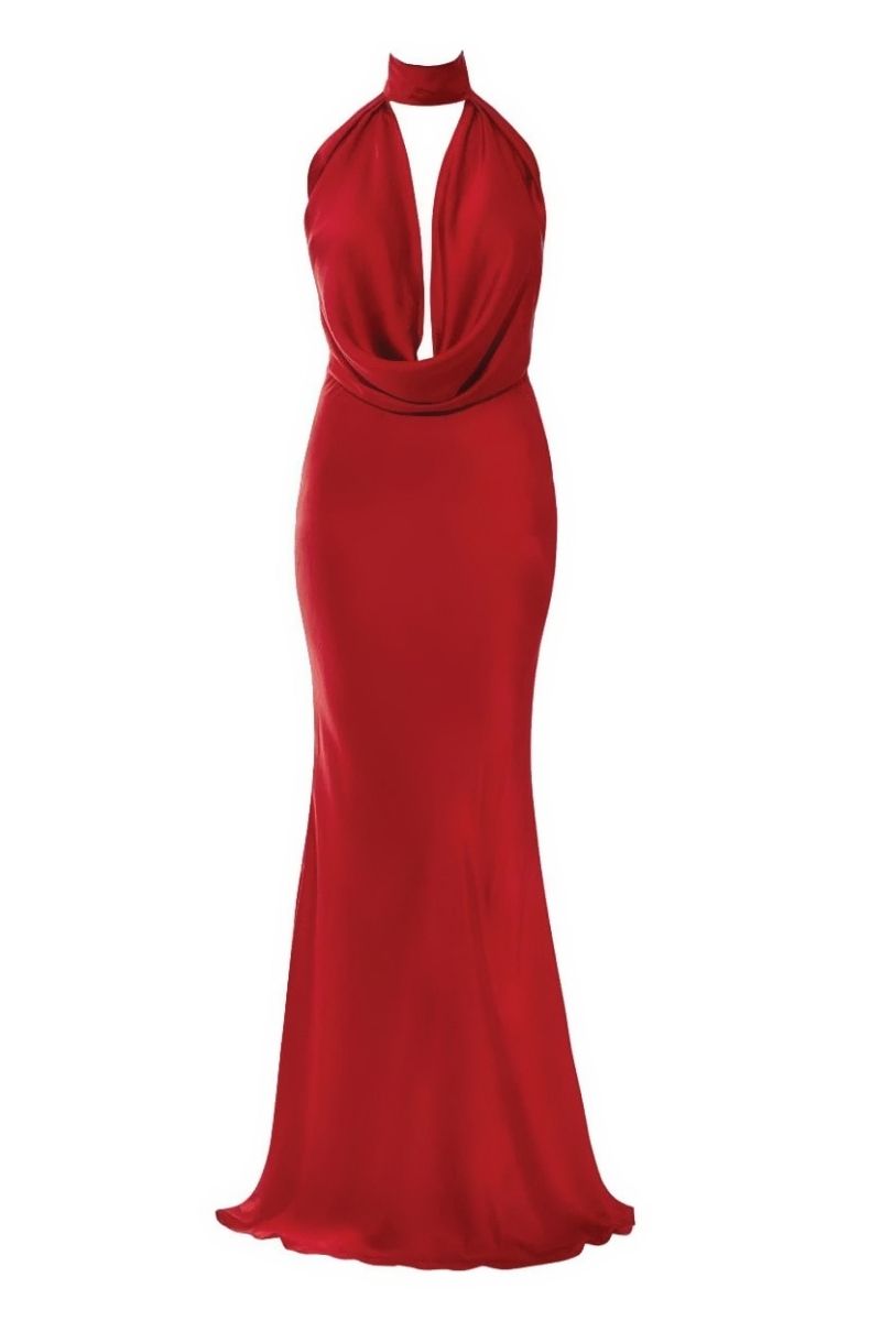 Exuding elegance, this satin long dress stuns with its alluring backless design and deep neck cutout, embodying sophistication and glamour for any special event.