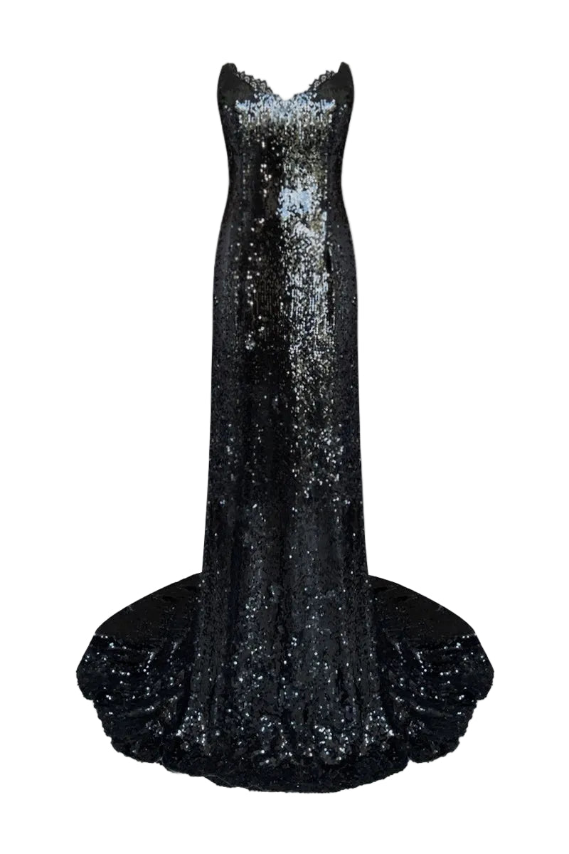 Katie Dress adds a timeless, dramatic, and sophisticated sparkle to modern evening dresses with its black sequin embellishments and Bardot neckline.