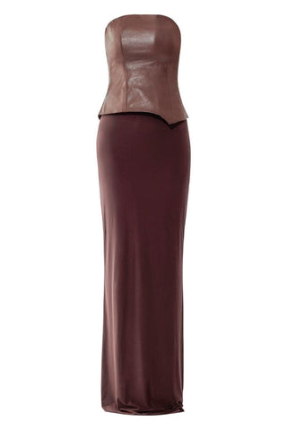 A leather corset top paired with a maxi skirt in lycra in a rich wine color creates