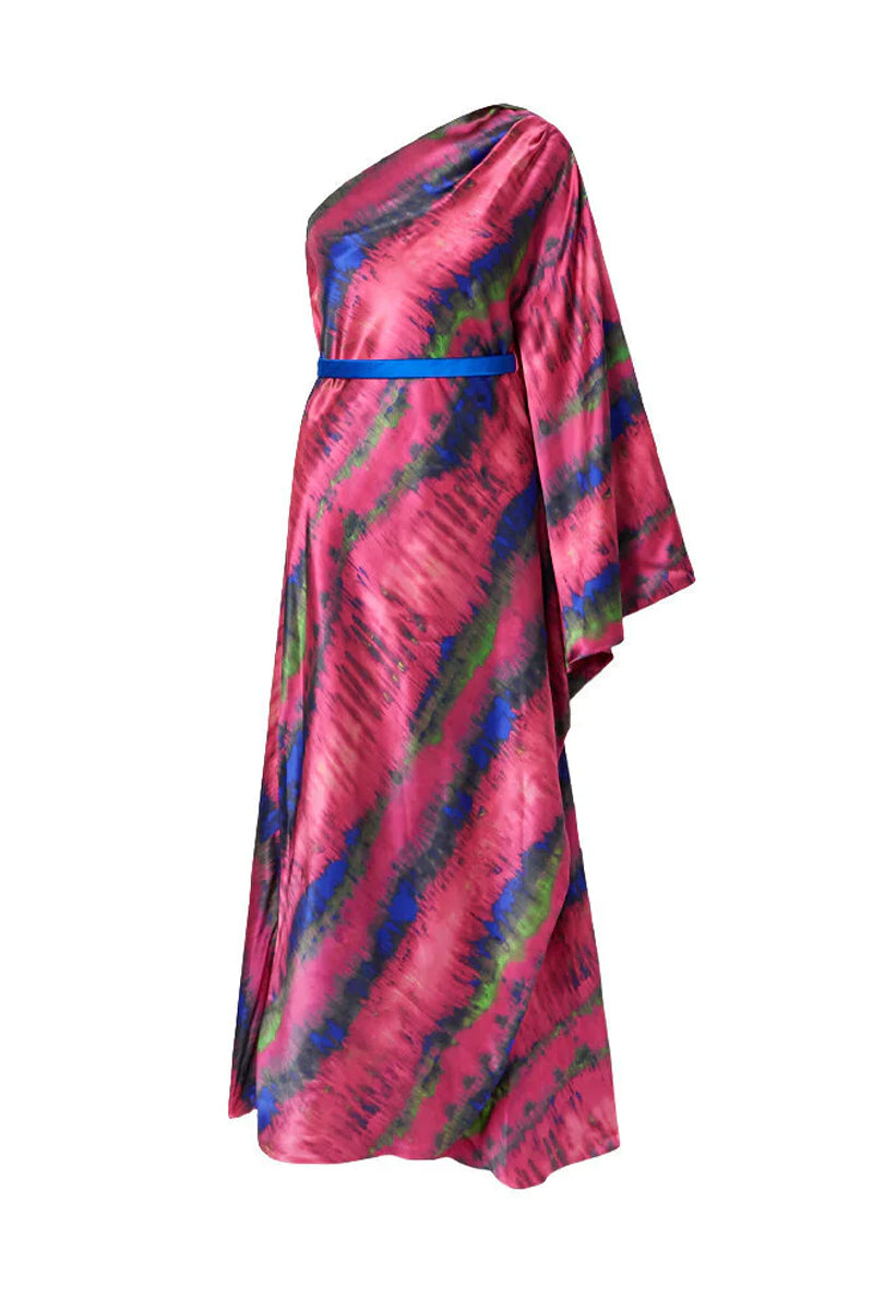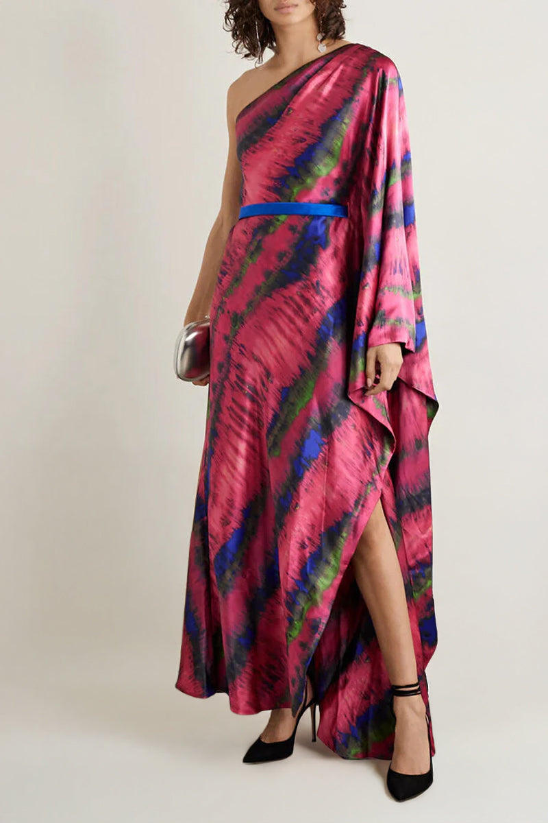 one shoulder draped tie-dyed silk-satin maxi dress in pink