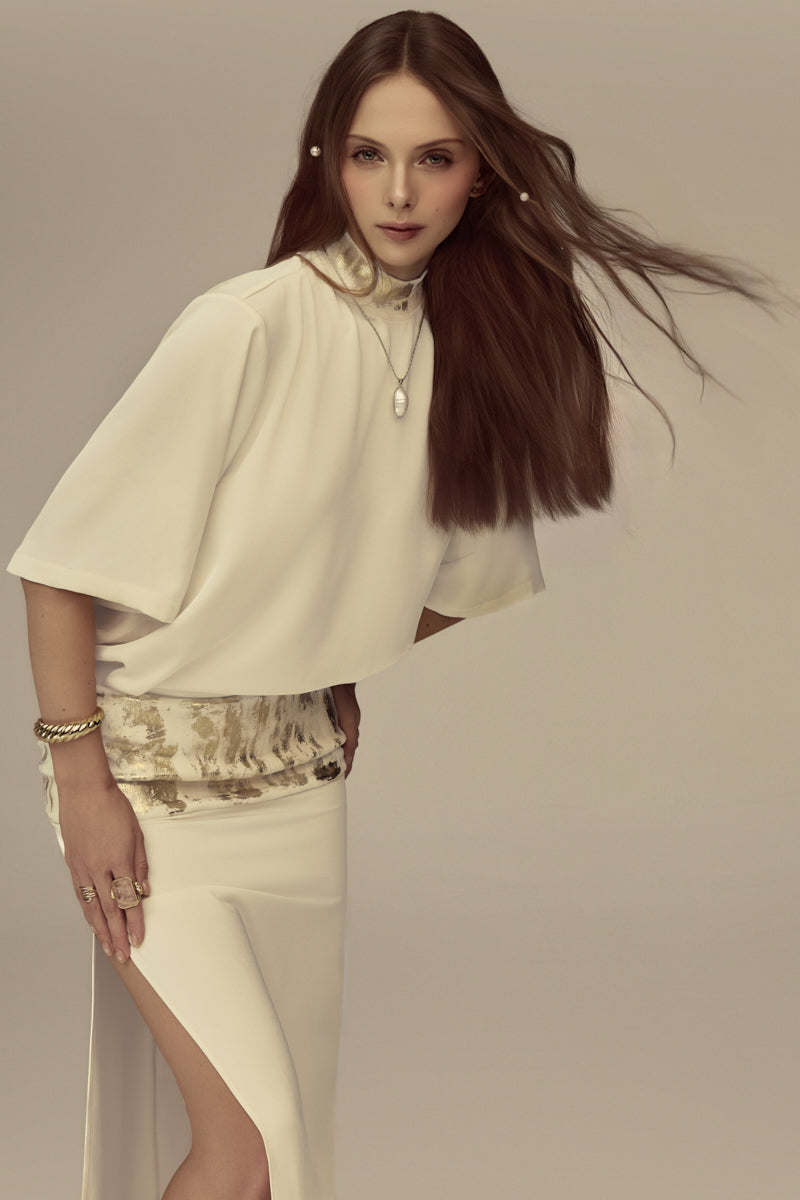 - Artistic gold foil detailing at collar and hip panel