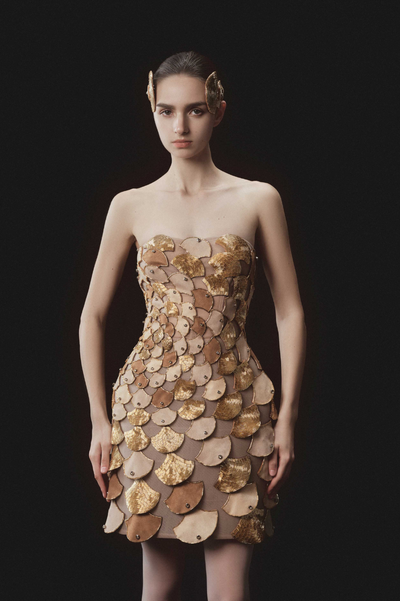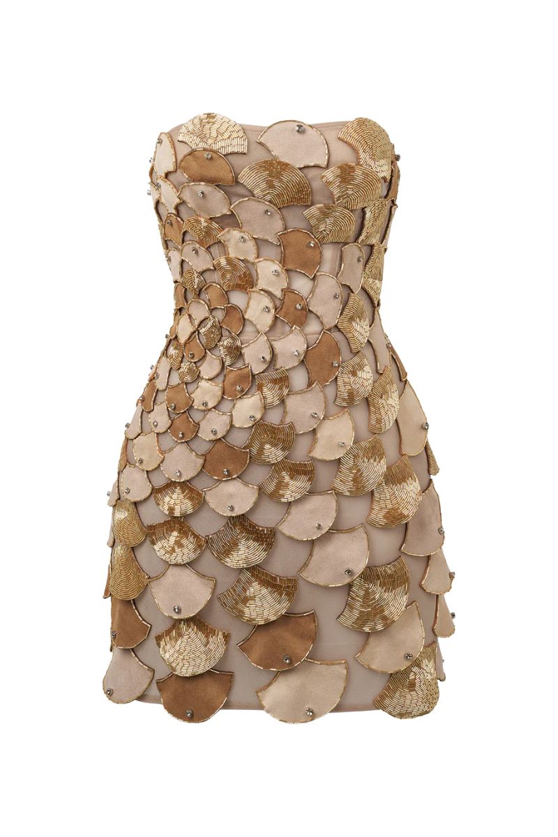 The sleeveless bustier dress with prominent bead embellishments accentuates elegance and sophistication. With a body-hugging design and exquisite decorative details, this dress is the perfect choice for special occasions.