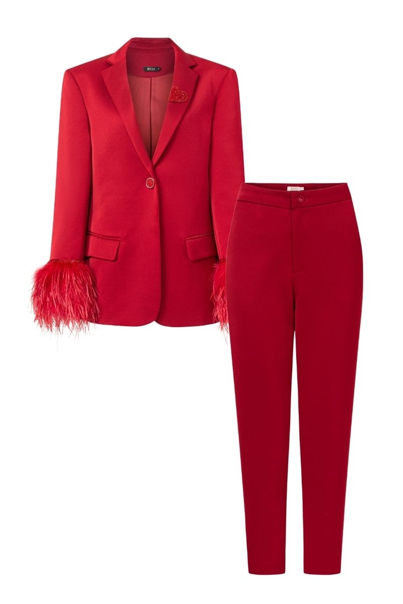 The standout detail lies in the feathered cuffs, bringing a playful yet refined touch that perfectly balances boldness and glamour. Paired with slim-fit trousers, this set offers a seamless blend of femininity and power dressing, making it ideal for high-profile events or stylish evenings out.