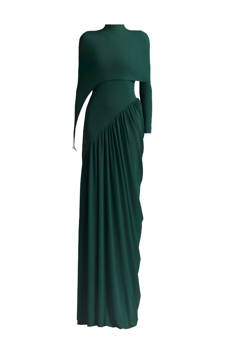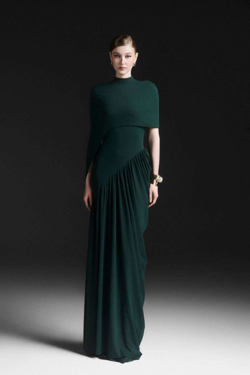 serelle ruched floor length dress in green