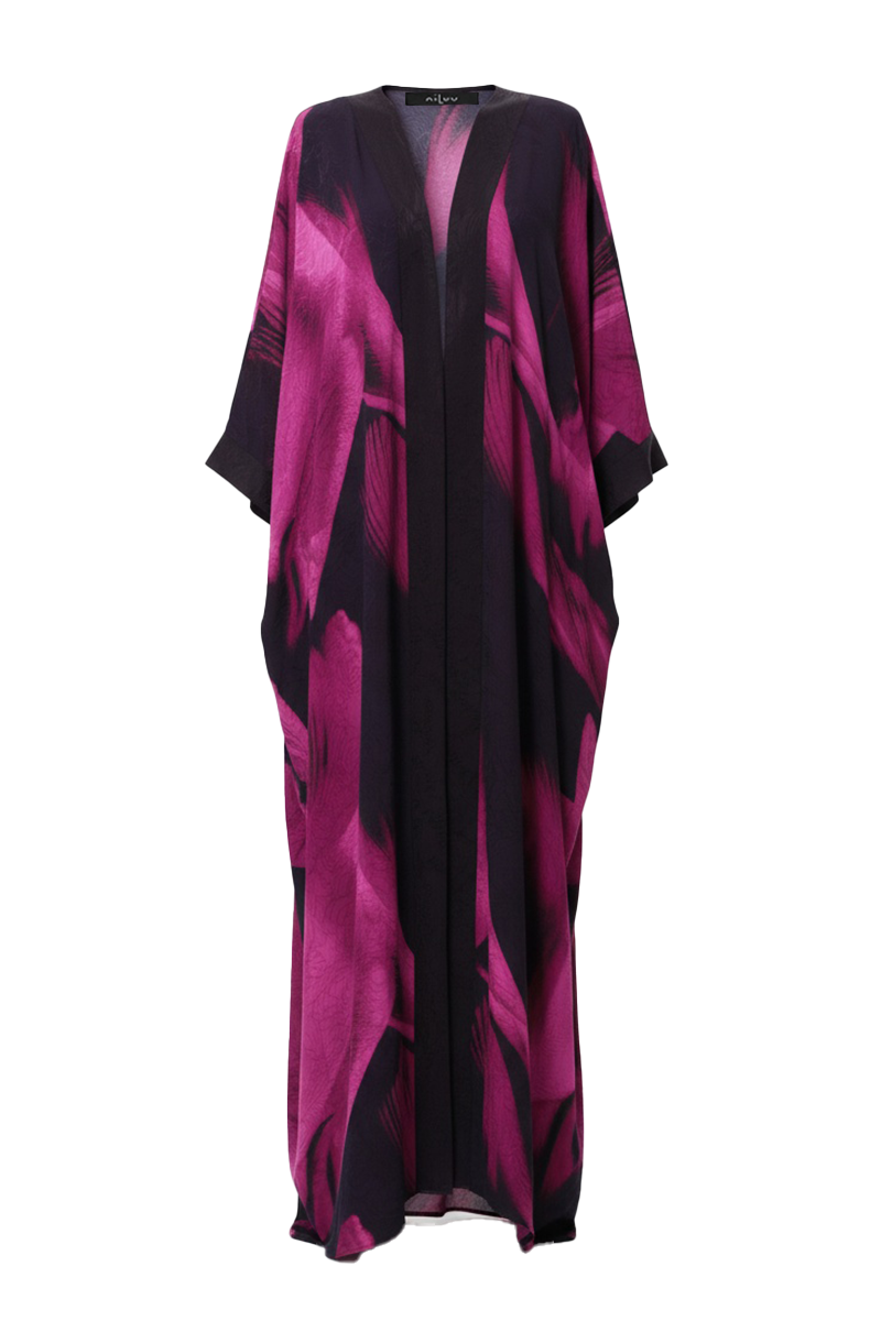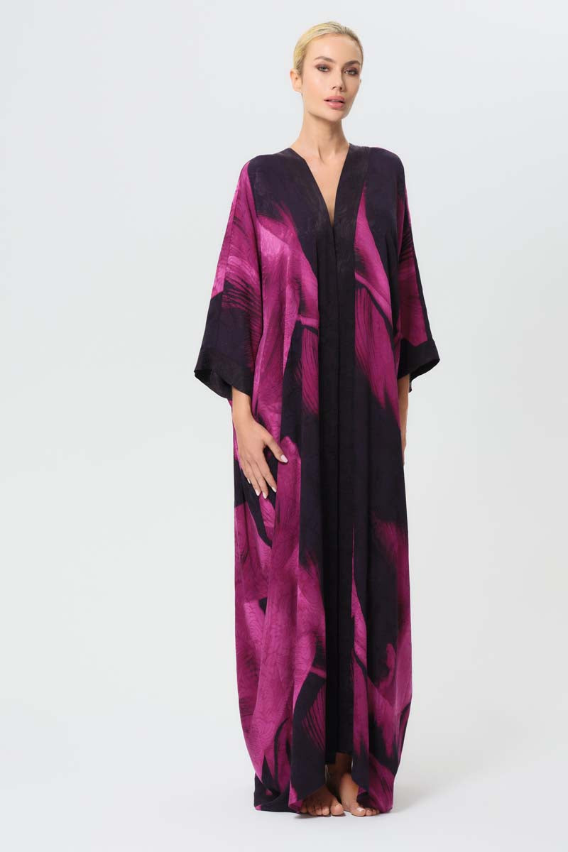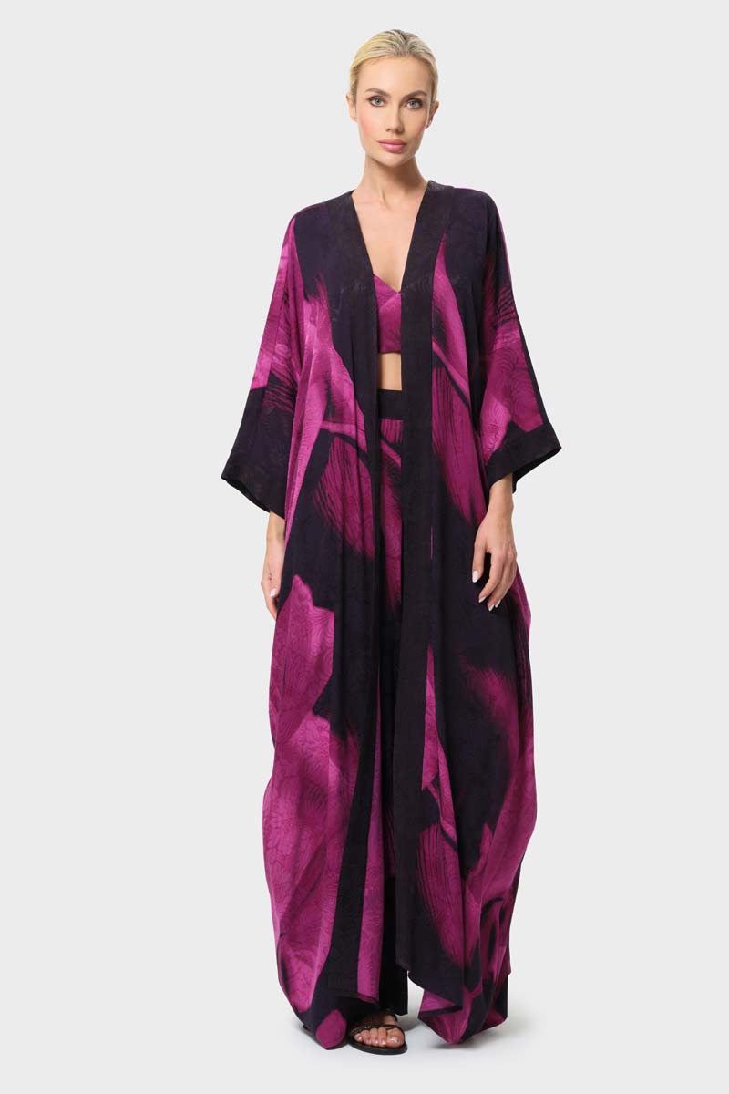 Experience effortless elegance with our modern take on the oriental kimono. The Anya Oriental Kimono features a fluid wrap front with voluminous sleeves that nod to traditional kimono design yet ensure a dramatic, timeless and modern silhouette. Its detachable, reversible obi belt is finished with a delicately stitched panel and accented with two silken tassels — details that elevate this piece with refined glamour. This floor-length kimono was designed with versatility in mind as the belt allows for a personalized fit. The kimono can be worn open for an effortless look or cinched for a more classic kimono style. Universally flattering and endlessly chic, the Anya Oriental Kimono pairs beautifully with the Scarlet Slip Dress as a statement ensemble or can be worn on its own as a symbol of modern sophistication.