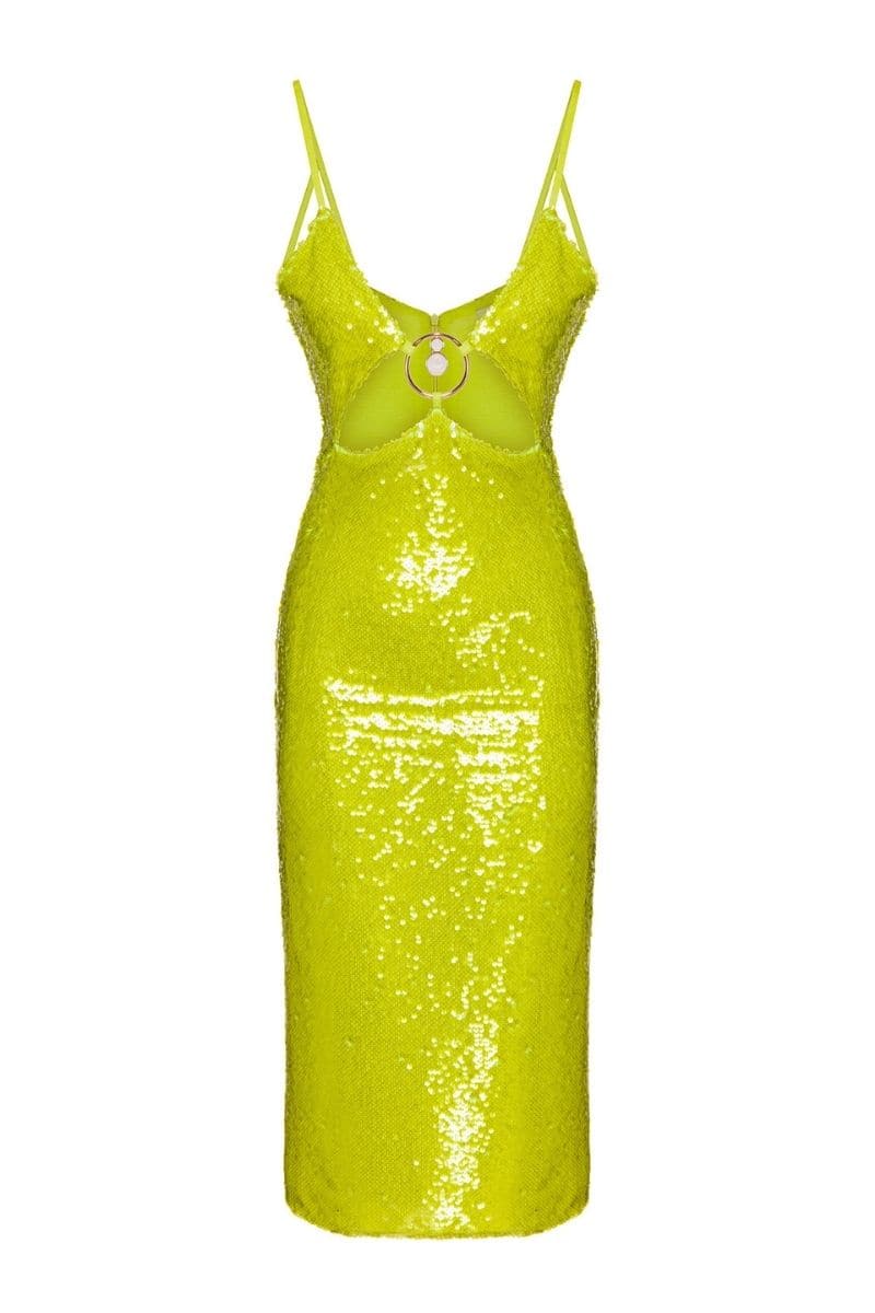 The Suri D ress is covered in light-catching lime sequins that create a fluid, liquid-like shine. It's designed in a body-skimming silhouette and flower look-a-like cut-out neckline. Keep accessories minimal and style it with barely-there sandals and a clutch.