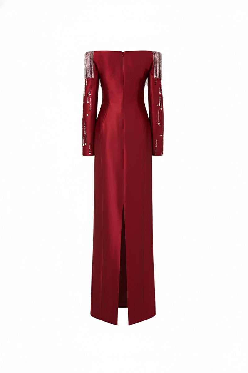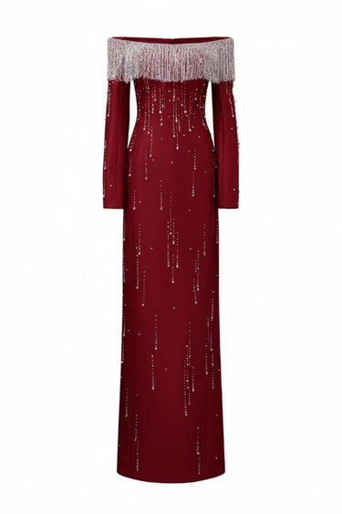 - Hand-beaded crystal fringe bodice