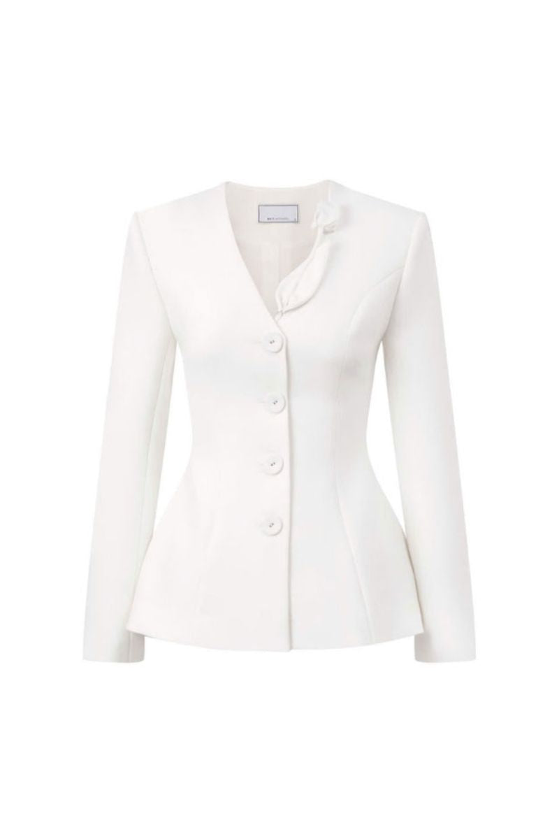 A tailored jacket cinched at the waist with gently flared hips for a flattering silhouette, adorned with elegant silk tulip appliqués and fully lined in luxurious silk.