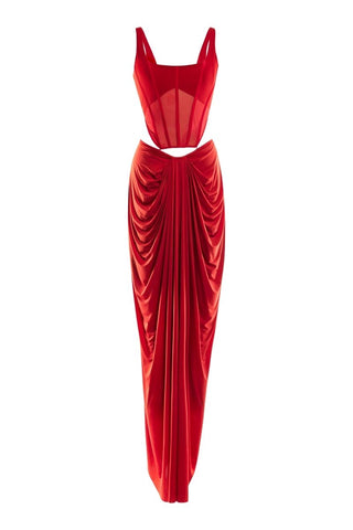 The corset bodice provides a structured and figure-flattering fit, accentuating your curves and adding a touch of vintage allure. The rich red hue exudes confidence and passion, while the draped skirt flows elegantly with every step, creating a sense of movement and grace. Attending a formal gala or a romantic evening event, this gown commands attention with its bold color, intricate corset detailing, and flowing draped skirt, making you the center of attention wherever you go.