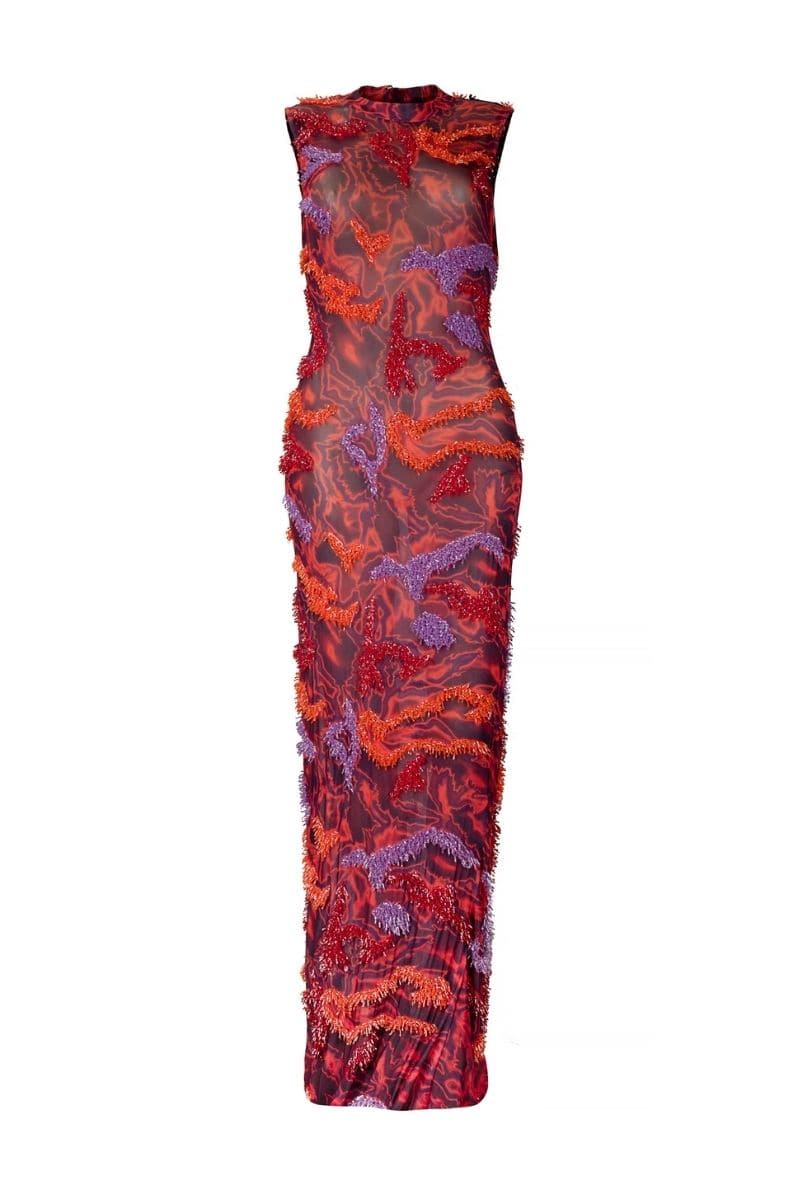 Sleeveless maxi zusi dress with hand beaded and embellished layers.